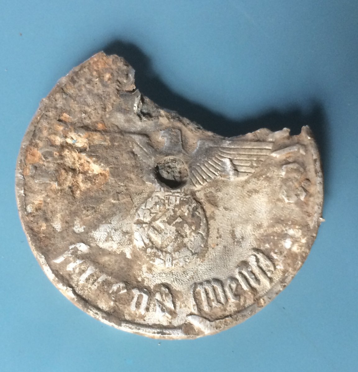 Предмет у плачевному стані,а алюміній для серйозних жетонів не використовували... Помити та акуратно почистити щіточкою,щоб максимально зберегти профіль та постаратися прочитати написи та розшифрувати їх залишки.Отвір для кріплення на знахідці знаходиться у центрі-можливо це була бірка чи інформаційний значок... До речі,на тильній стороні нічого нема?