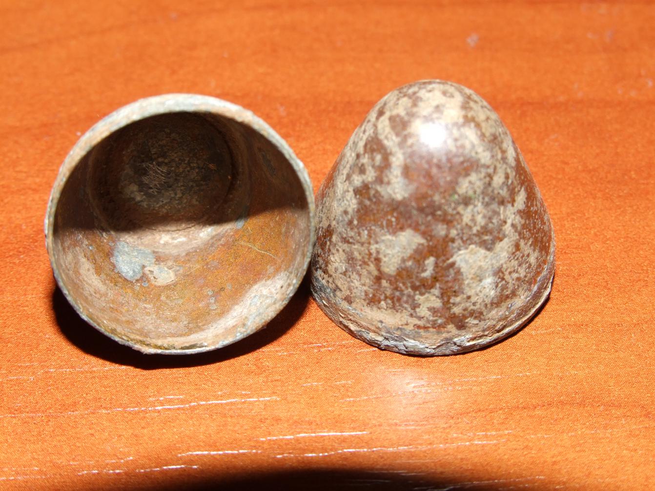Вот, осмотрел и снял ранее найденные колпачки. Вопросов больше чем ответов. На маленьком (фото 1) нет никаких клейм. На большом - буква R (насколько можно судить). На третьем колпачке промежуточного размера есть и год и клеймо русскими буквами. Все изготовлены в одинаковой однотипной манере. По третьему колпачку сомнений нет - РККА. А вот по первым двум...
