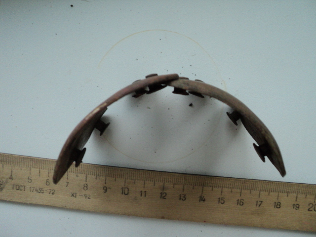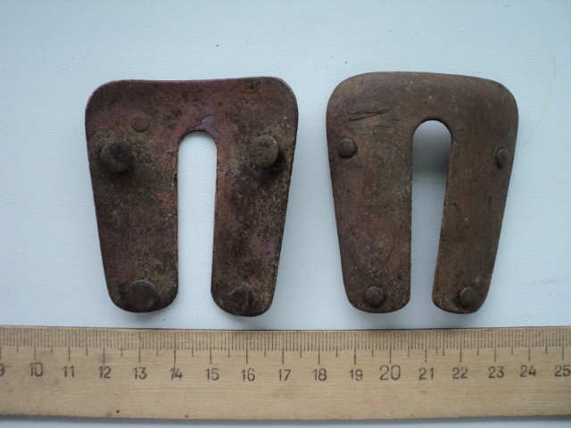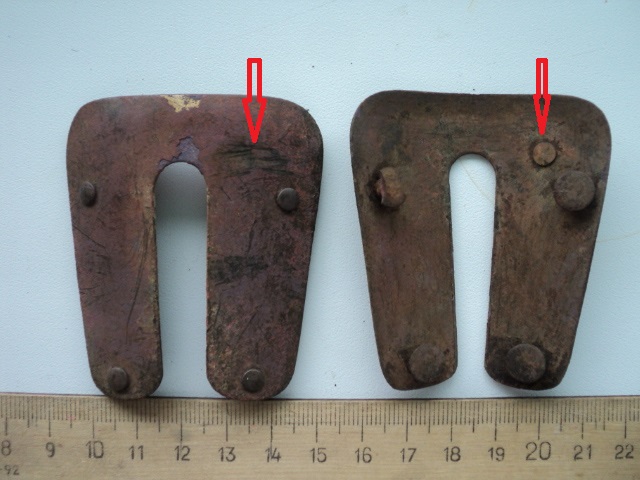 Найдена пара одинаковых накладок. Приклепывались 4 заклепками на ткань или кожу, возможно. Непонятно назначение маленькой пятой. Она с выпуклой стороны почему-то затерта. Найдены в бывшей Восточной Пруссии. Без сопутки. Материал бронза или латунь. Под патиной желтого цвета.