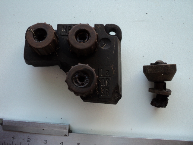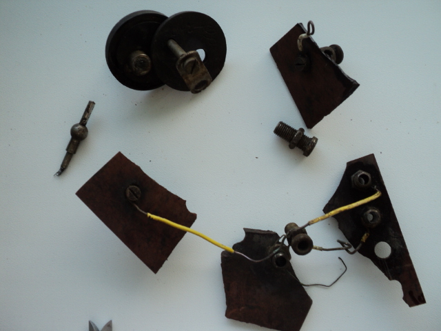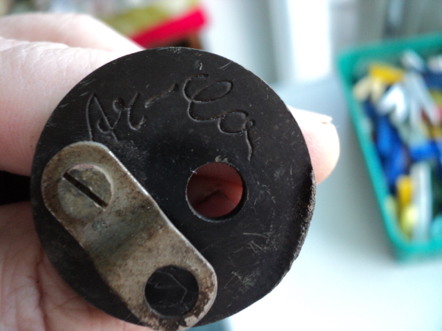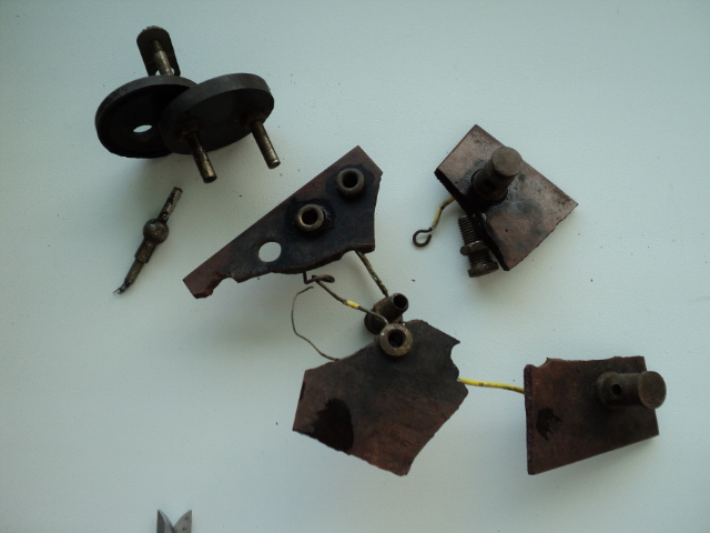 Вот обломки на бакелите вырыл в лесу. На остатках, напоминающих электровилку надпись и птица. Что это было? И еще обломок, найденный в другом месте, хотя и недалеко, метрах в 20-30. Тоже от чего?