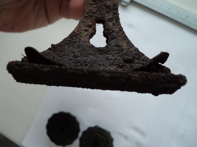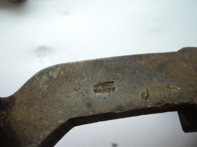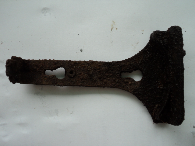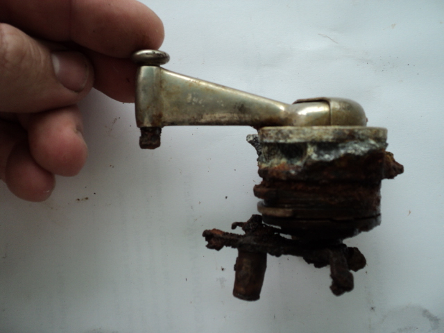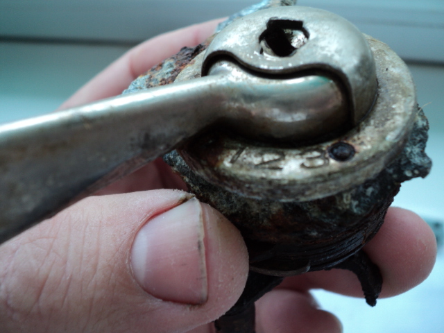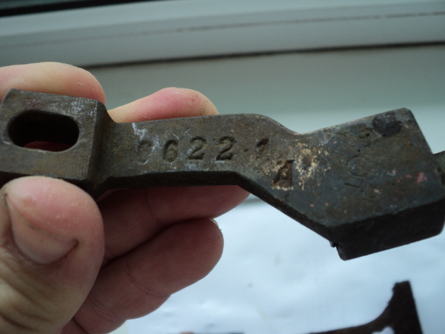 Вот такие предметы вырыли в последний раз. Какая-то непонятная деталь с обломком трубки и клеймами (есть птичка). Что это? Какой-то цилиндр с отверстиями и резьбой. Клейм нет. Не знаю, что это. Потом какая-то железка с пружиной и двумя вырезами типа замочных скважин. Может от оружия? Какой-то переключатель с клеймами DM и 123. И пробки от аккумулятора. Картинки почему-то разные.