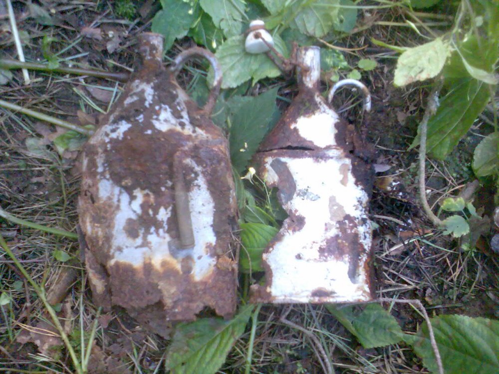 Найдены в лесу эмалированные, одна с фарфоровой пробкой.
