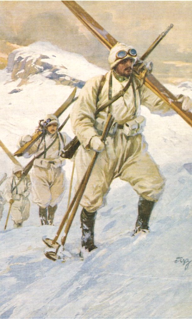 Открытки по MONTE CERVINO, выполнены в наше время в стиле "под старину". 1. Открытка посвященная батальону альпийских парашютистов MONTE CERVINO, который образовался 14 июля 1996г. С 25 сентября 2004г. как отдельный входит в 4-ый полк альпийских парашютистов. 2. Открытка посвящена лыжному батальону MONTE CERVINO, внизу девиз батальона PISTA! – (ЛЫЖНЮ!), вверху кокарда с номером альпийского полка, история которого и история батальона начиная с 1915г. тесно переплетены. 3. Судя по экипировке, бойцы MONTE CERVINO, во время Первой мировой.