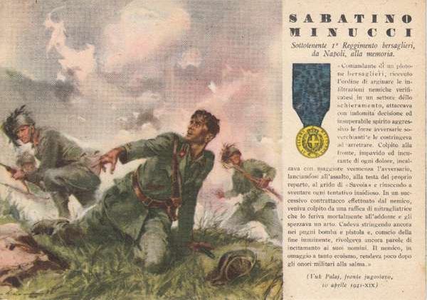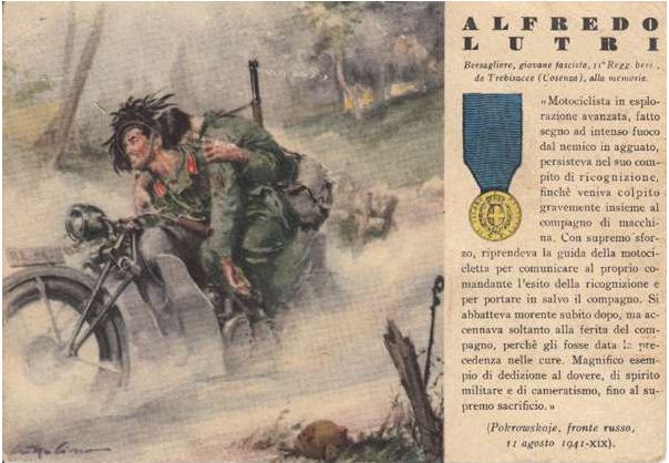 Берсальер на мотоцикле - это один из первых итальянский солдат, погибших на Русском фронте в августе 1941г. В любом случае - первый награжденный за бои в России золотой медалью "За воинскую доблесть". На ветке "Итальянцы в России" в этом году обсуждалась в связи с боями под Николаевом и был перевод. Будучи сам ранен, вывез тяжело раненного товарища и умер от ран, полученных еще до того.