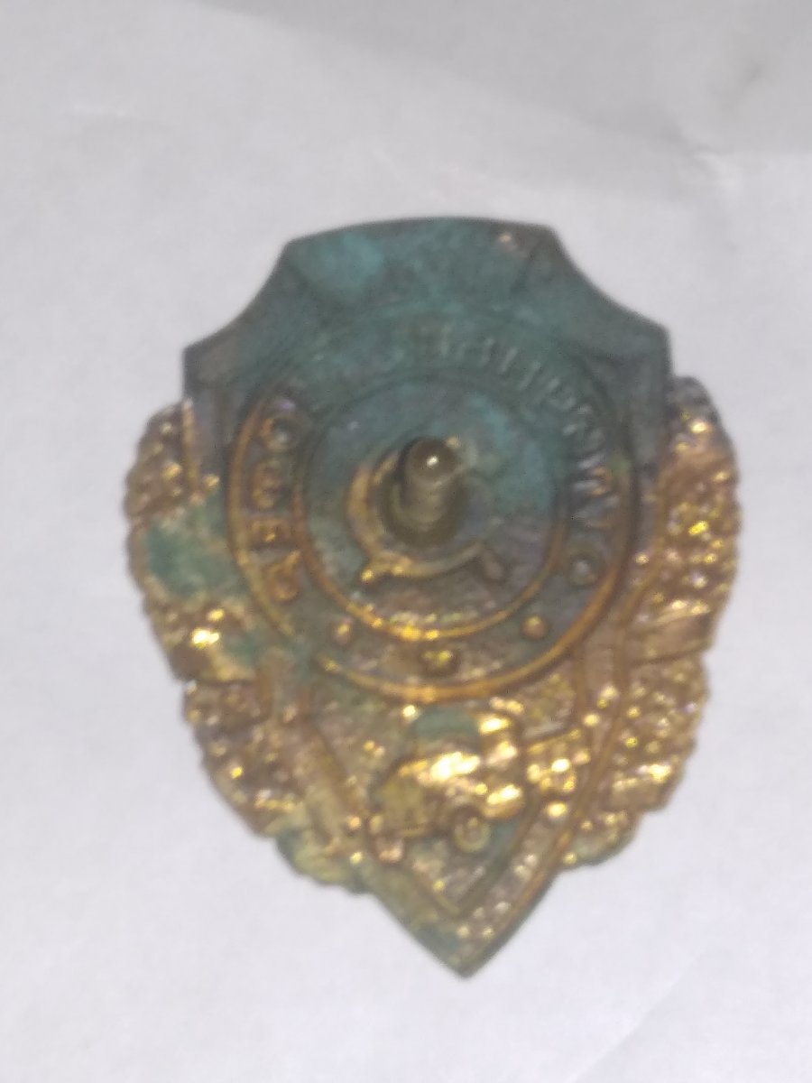 Вітаю. Щоб відповісти на Ваше питання, вимушений показати фото з сусіднього ресурсу. Іншого немає. Значок бачиться оригінальним. Є ще фото у мене такого значка, але з закруткою - тільки таке. Успіхів.