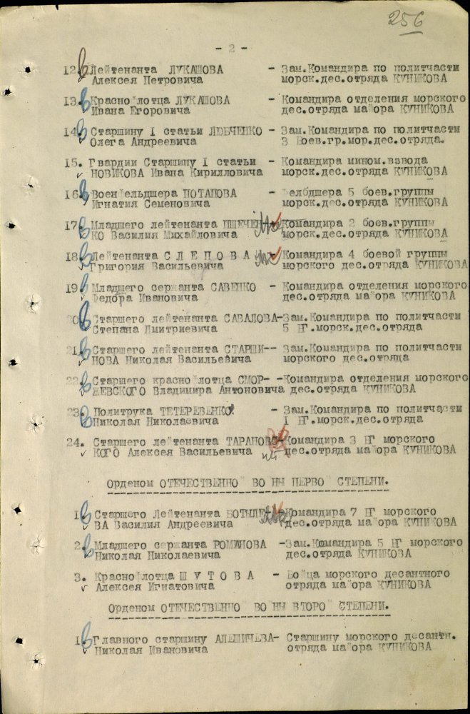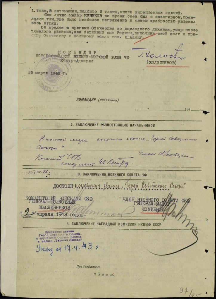 или Быков Алексей Федорович Последнее место службы ЧФ, Новороссийская ВМБ отряд особ. назнач. 62 ЗАП Воинское звание краснофлотец Причина выбытия пропал без вести 6 февраля 1943 года Жив (отряд Куникова) Ходырев Василий Семенович Последнее место службы ЧФ, Новороссийская ВМБ отряд Куникова Воинское звание краснофлотец Причина выбытия погиб Дата выбытия 25.03.1943