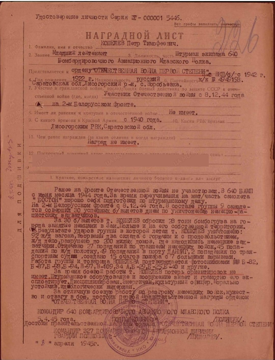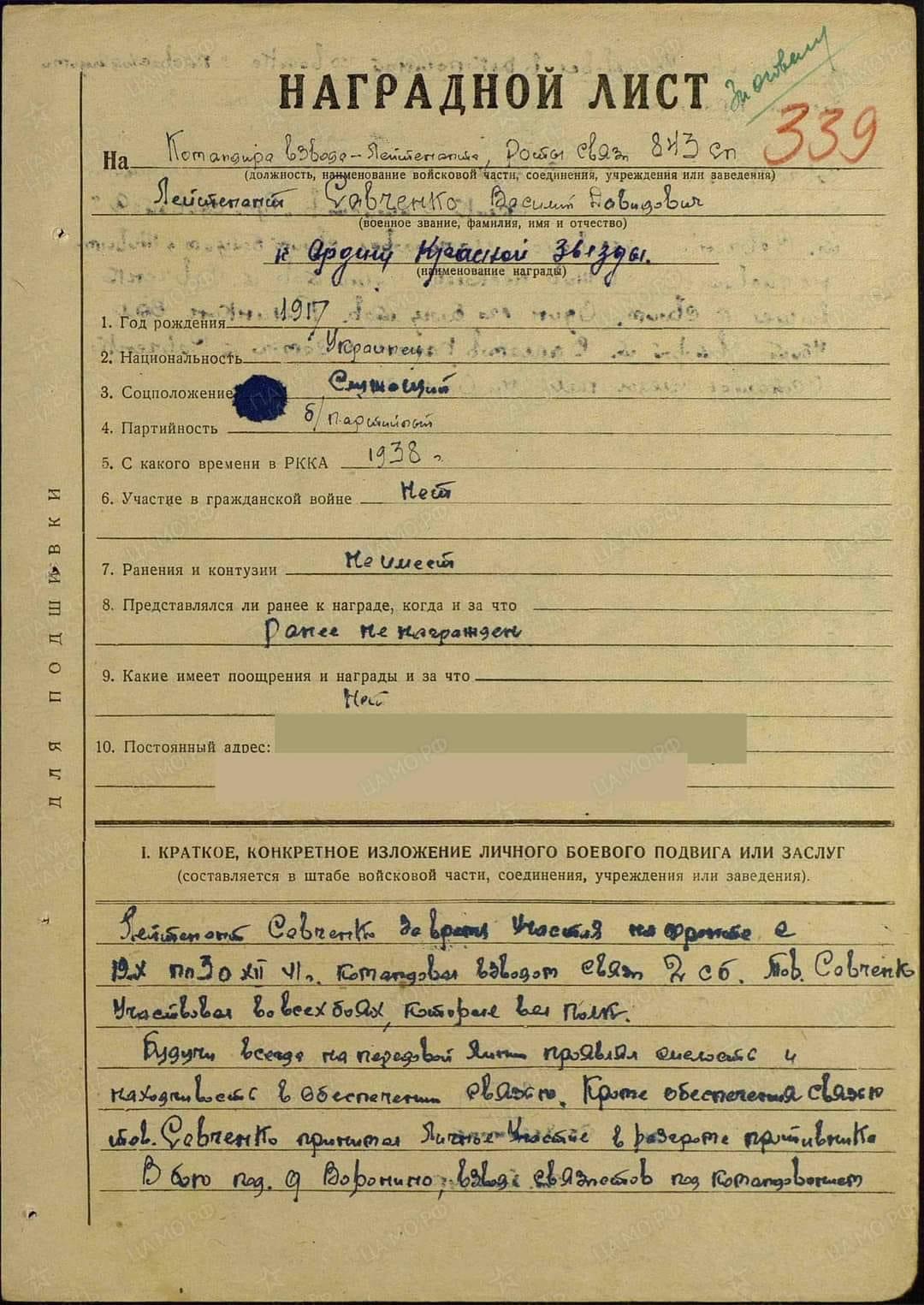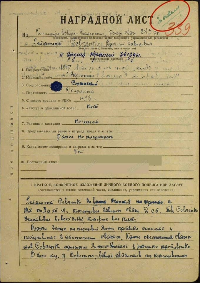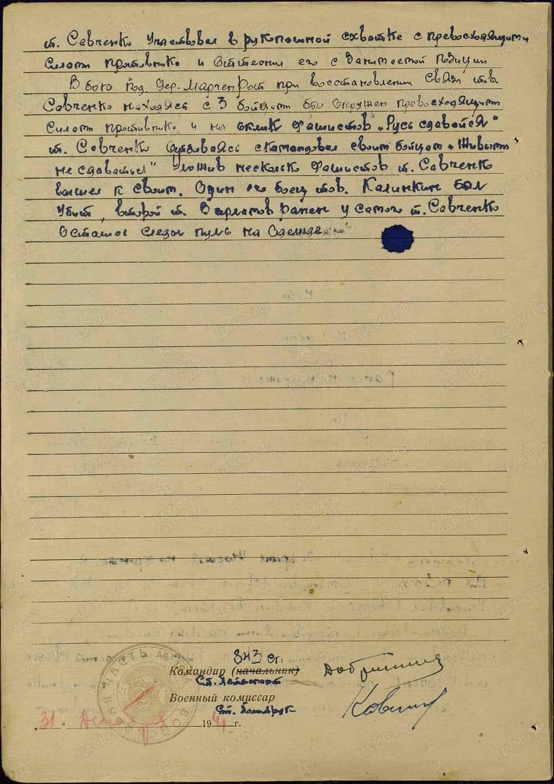 Кстати очень сильный наградной у товарища Савченко. Из наградного листа: В бою под деревней Марчепрот при восстановлении связи тов. Савченко находясь с трема бойцами был окружен превосходящими силами противника и на склик фашистов « Русь сдавайся» тов. Савченко отбиваясь скомандовал своим бойцам «живим не сдаваться» Уложив несколько фашистов тов. Савченко вышел к своим. Один его боец тов. Калинкин был убит, второй тов. Верломов ранен, у самого товарища Савченко остались следы пуль на одежде!