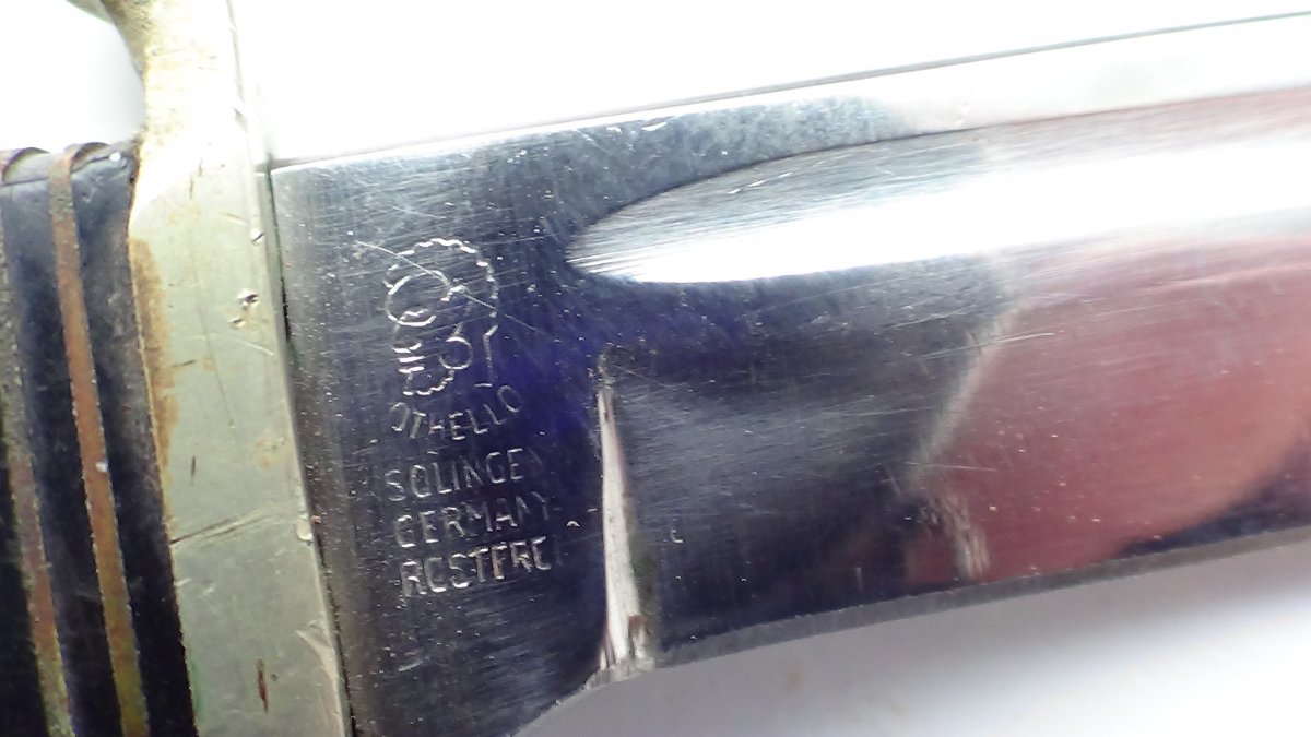 Охотничий нож Othello Solingen Германия. Люфтов, шатов нет. Рукоять-рог. Общая длина-20,5см, клинок-10,5 см. обух-3,8 Цена-1550грн.