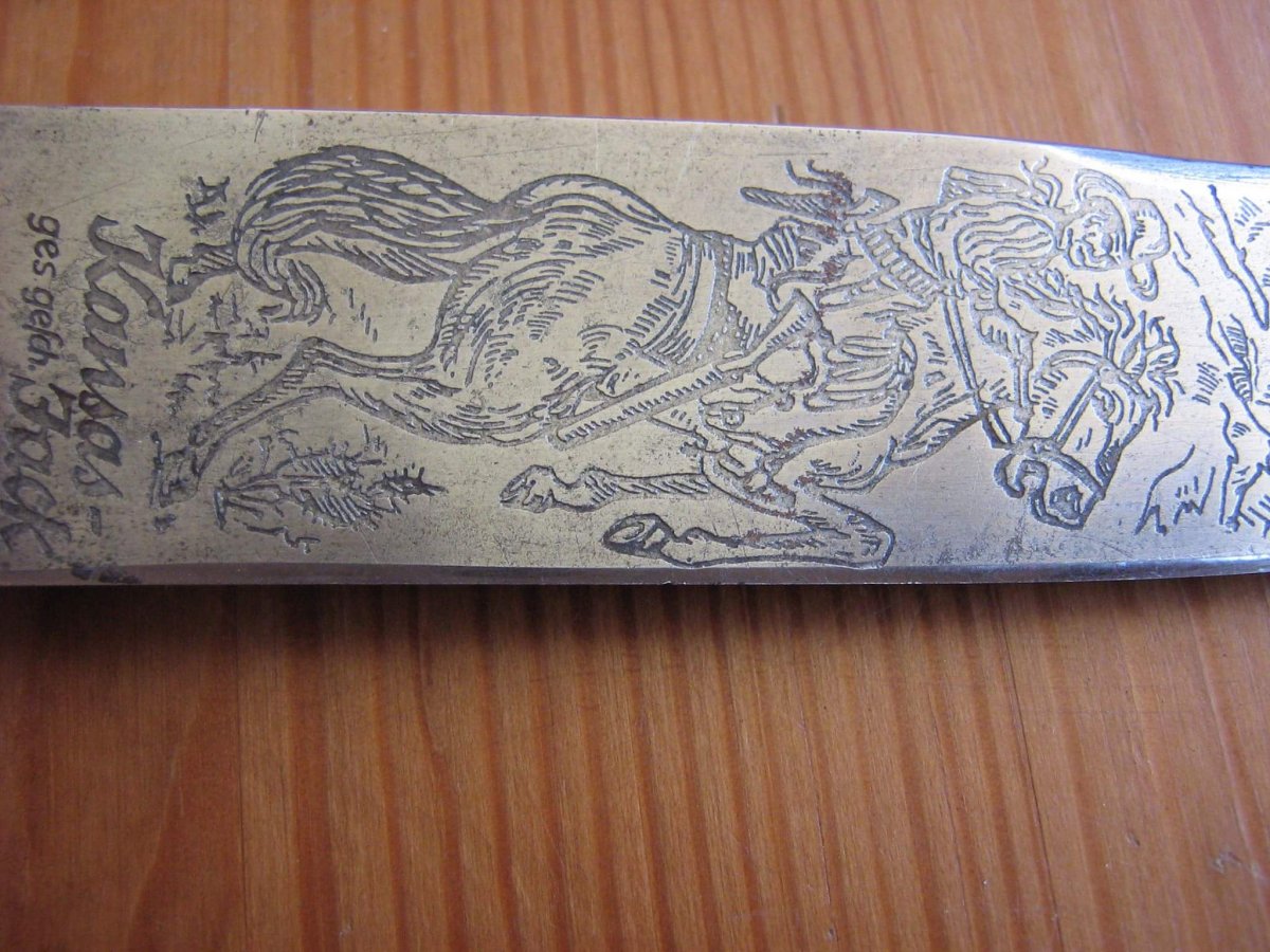 Копии подобных ножей как ни странно, но делали в Бразили под немецкими брендами в 60е-70е.Конкретно этот немецкий, но переделка или зборной, с травлением ошибся- похоже родное.