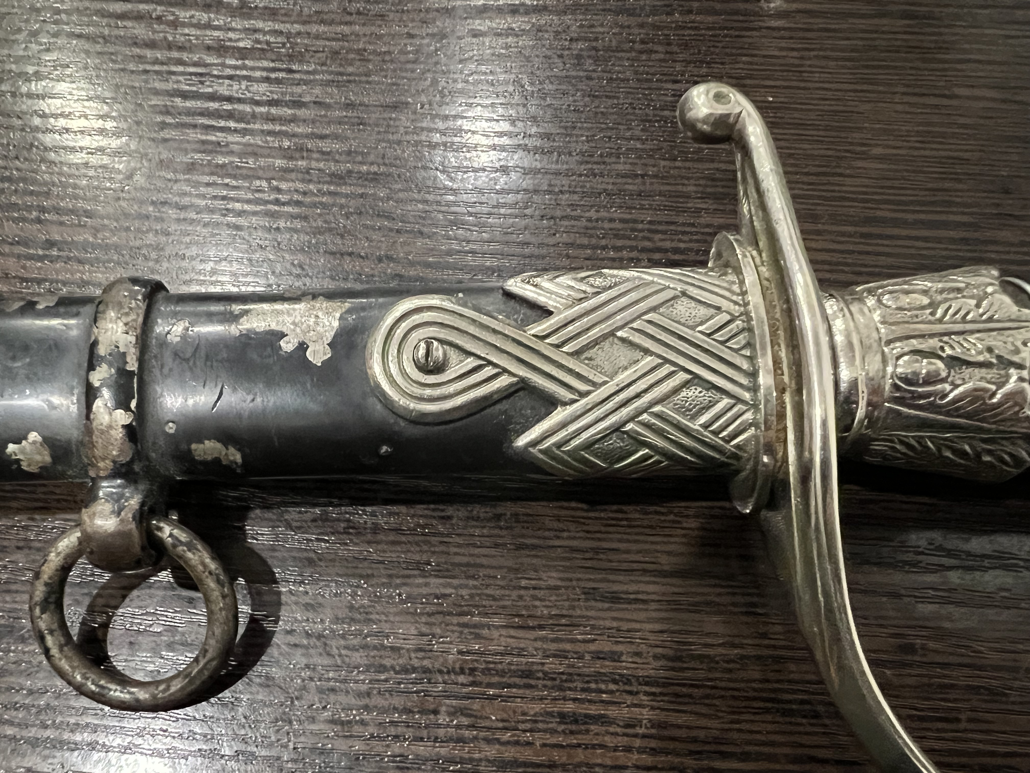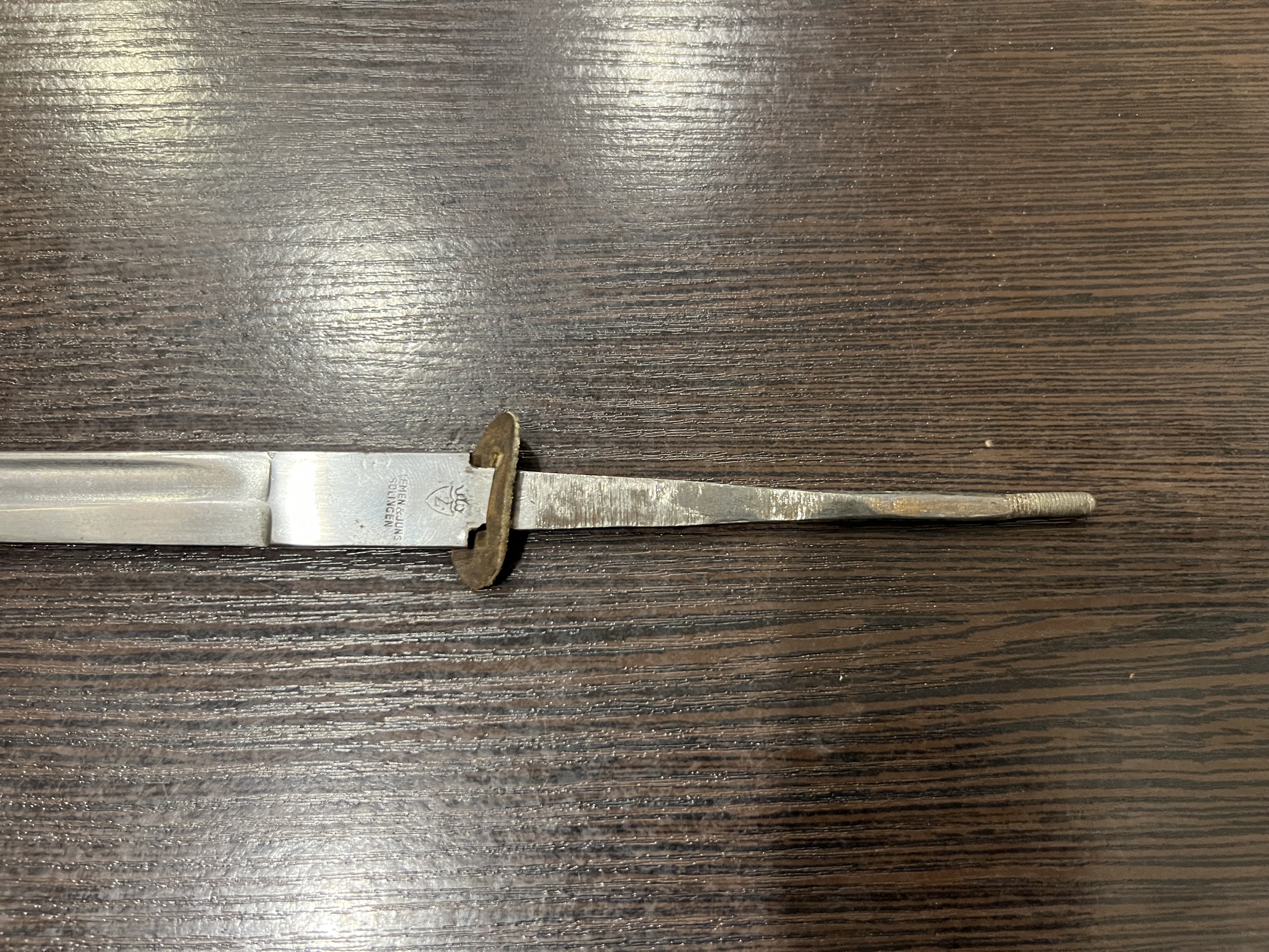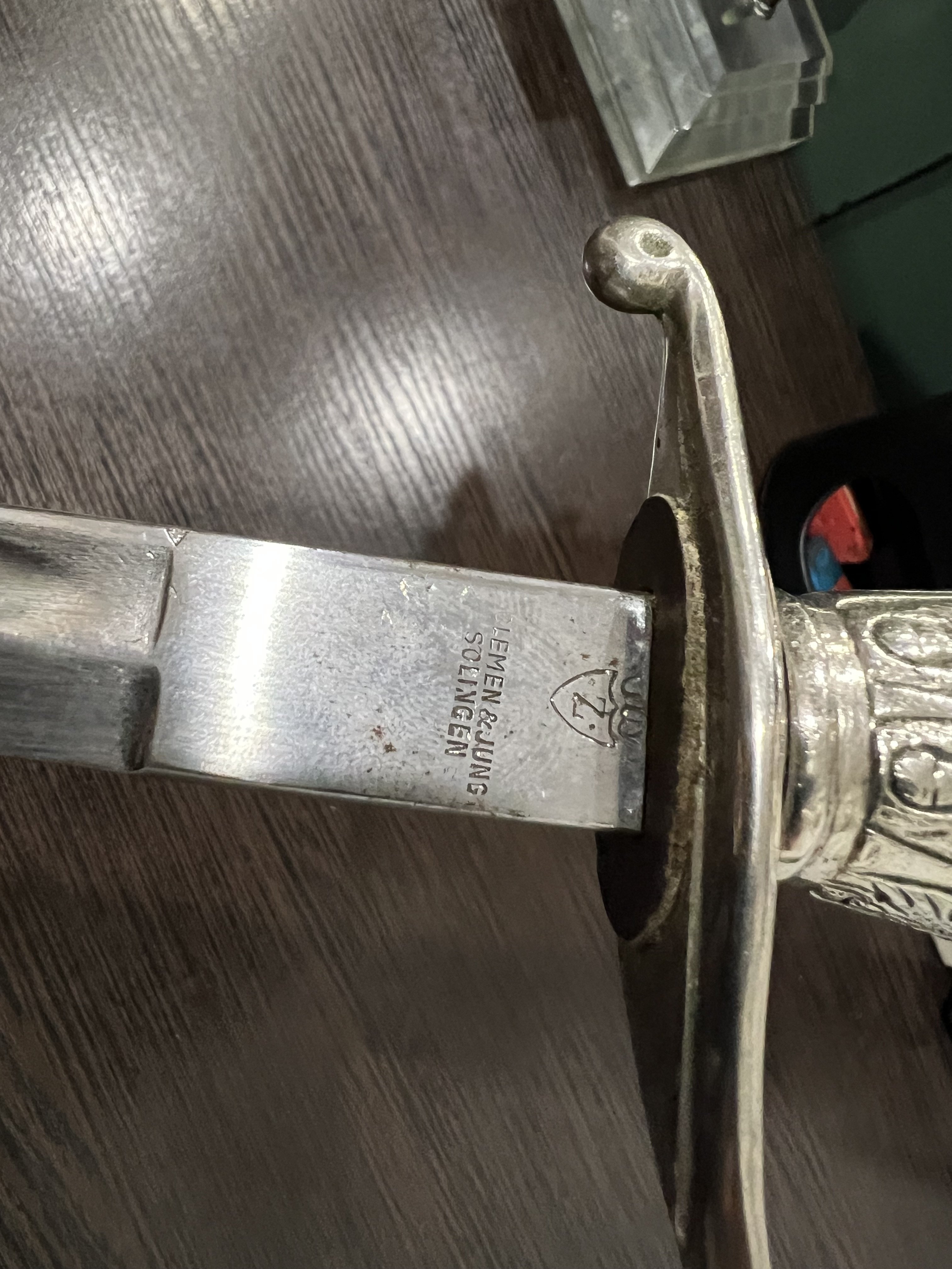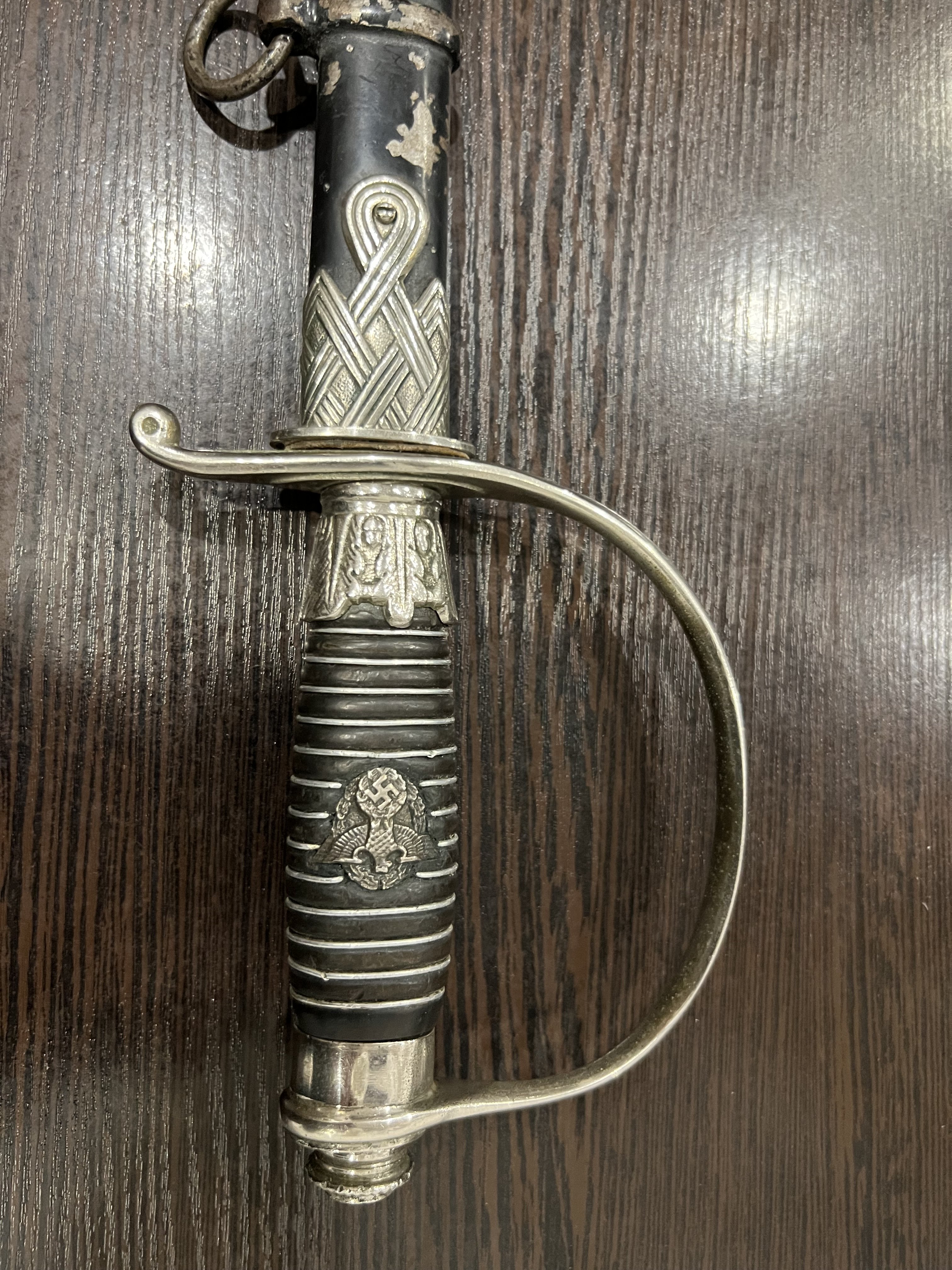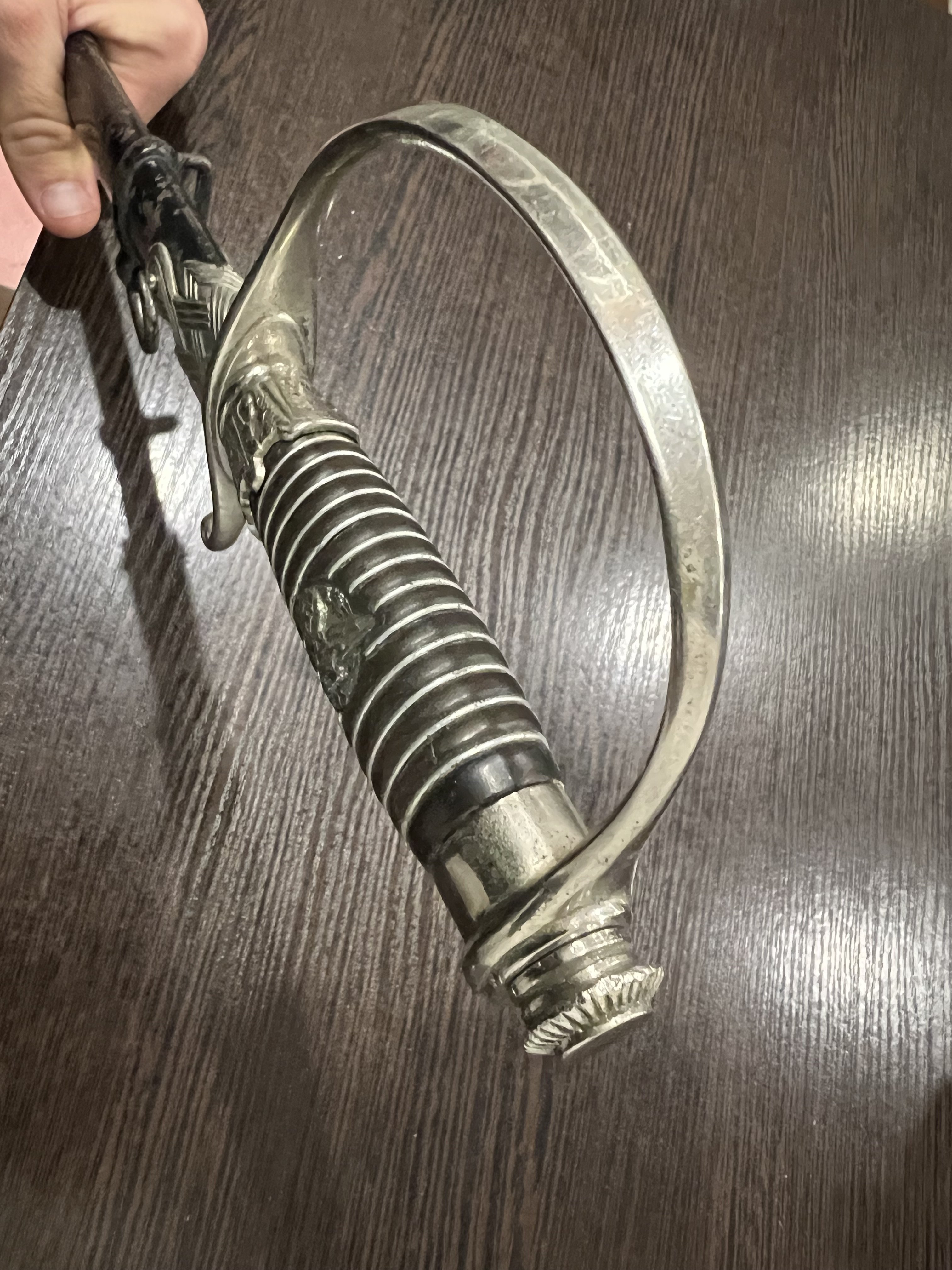 Я думаю оригинального в ней нет ни чего, навершие не оно, обратите внимание на его верх-нет опаясывающего кантика по верху,оно просто плоское и кривое,клинок без покрытия, клеймо нанесено на оборот, т.е. фирменный знак и надпись нужно поменять местами, так я видел на без вопросных палашах этого производителя.Гарда вся в кратерах под покрытием,такое обычно бывает при литье копий под давлением.Ножны не оригинал,отлиты вместе с кольцами! Длинное не моя тема,может у кого есть другое мнение.