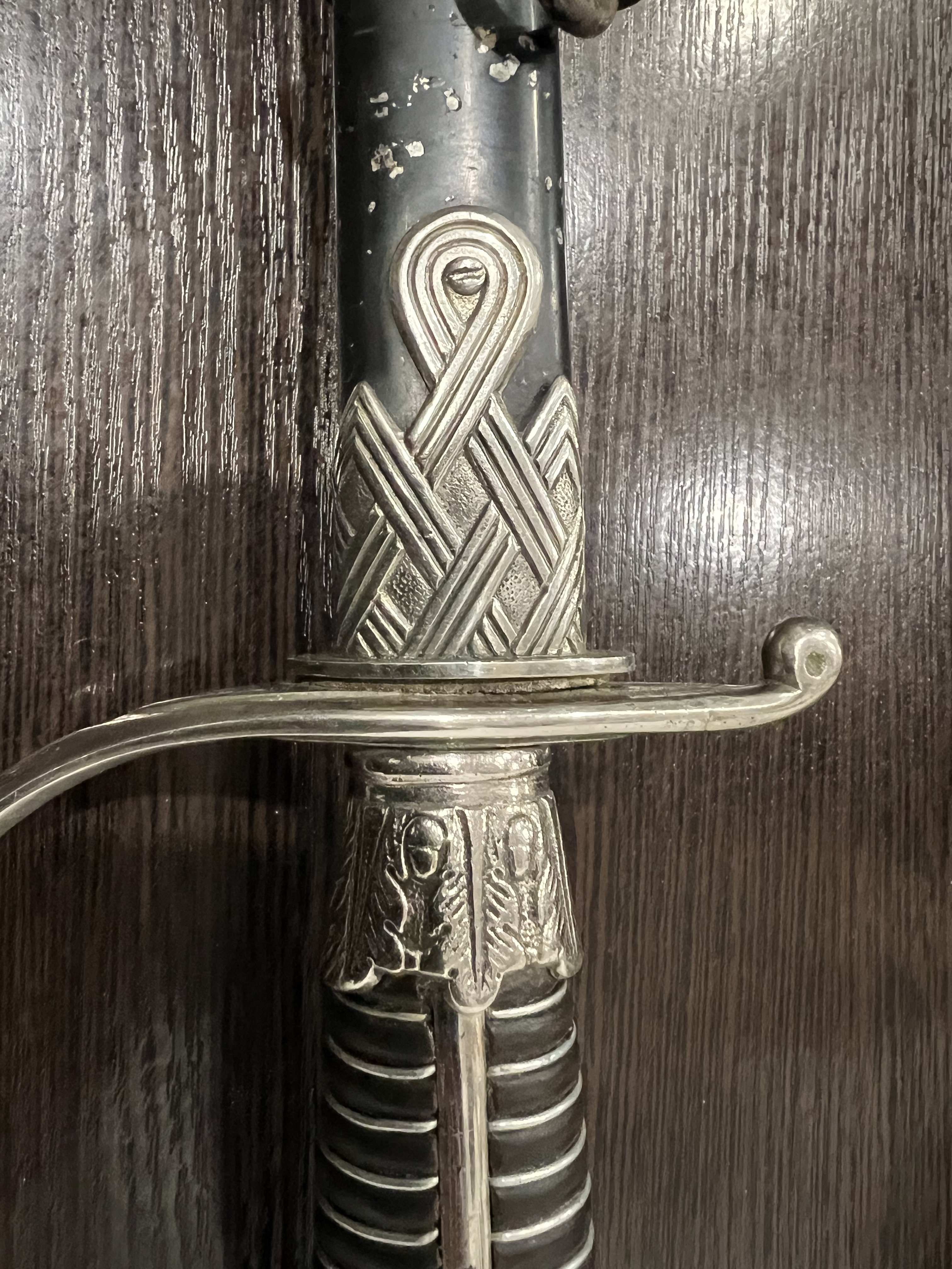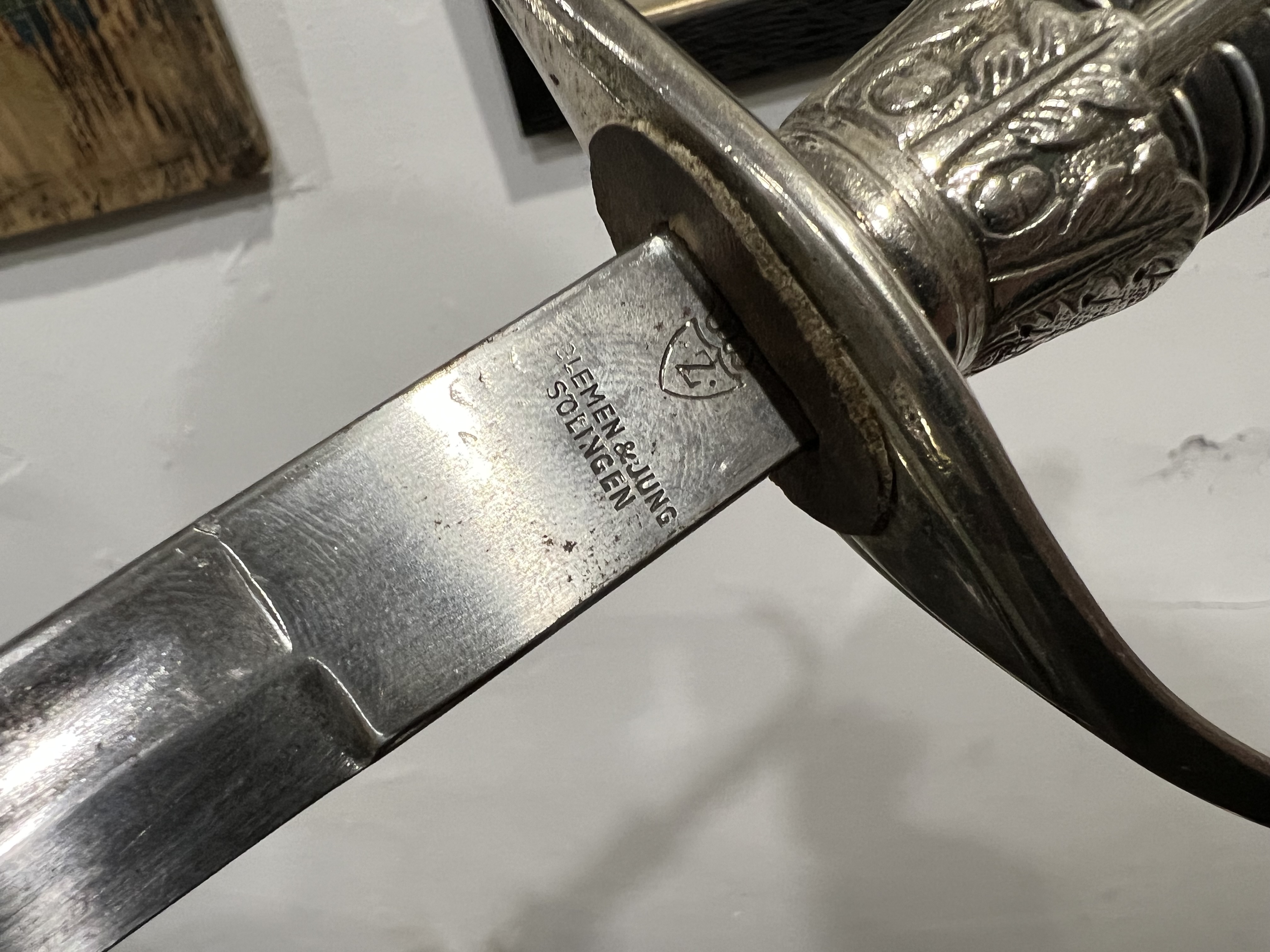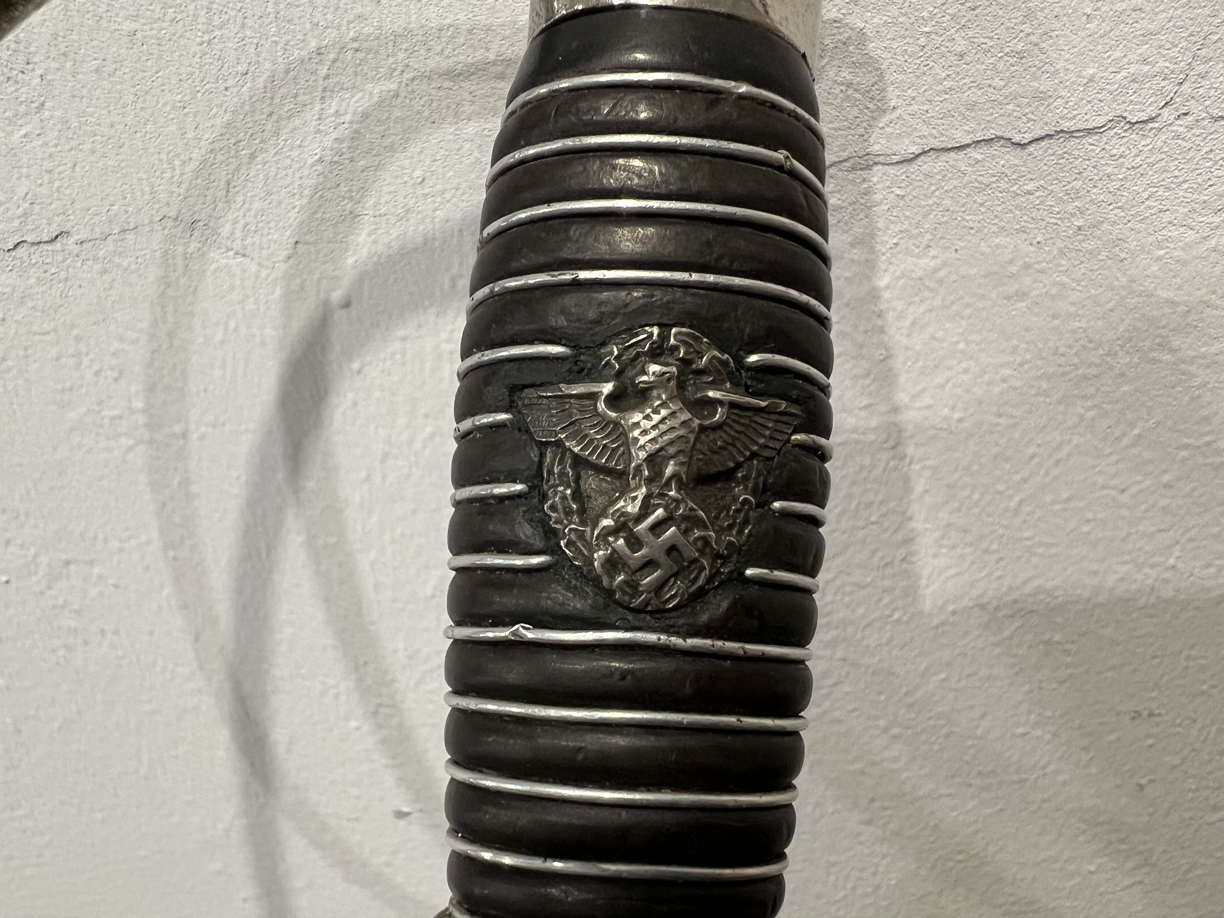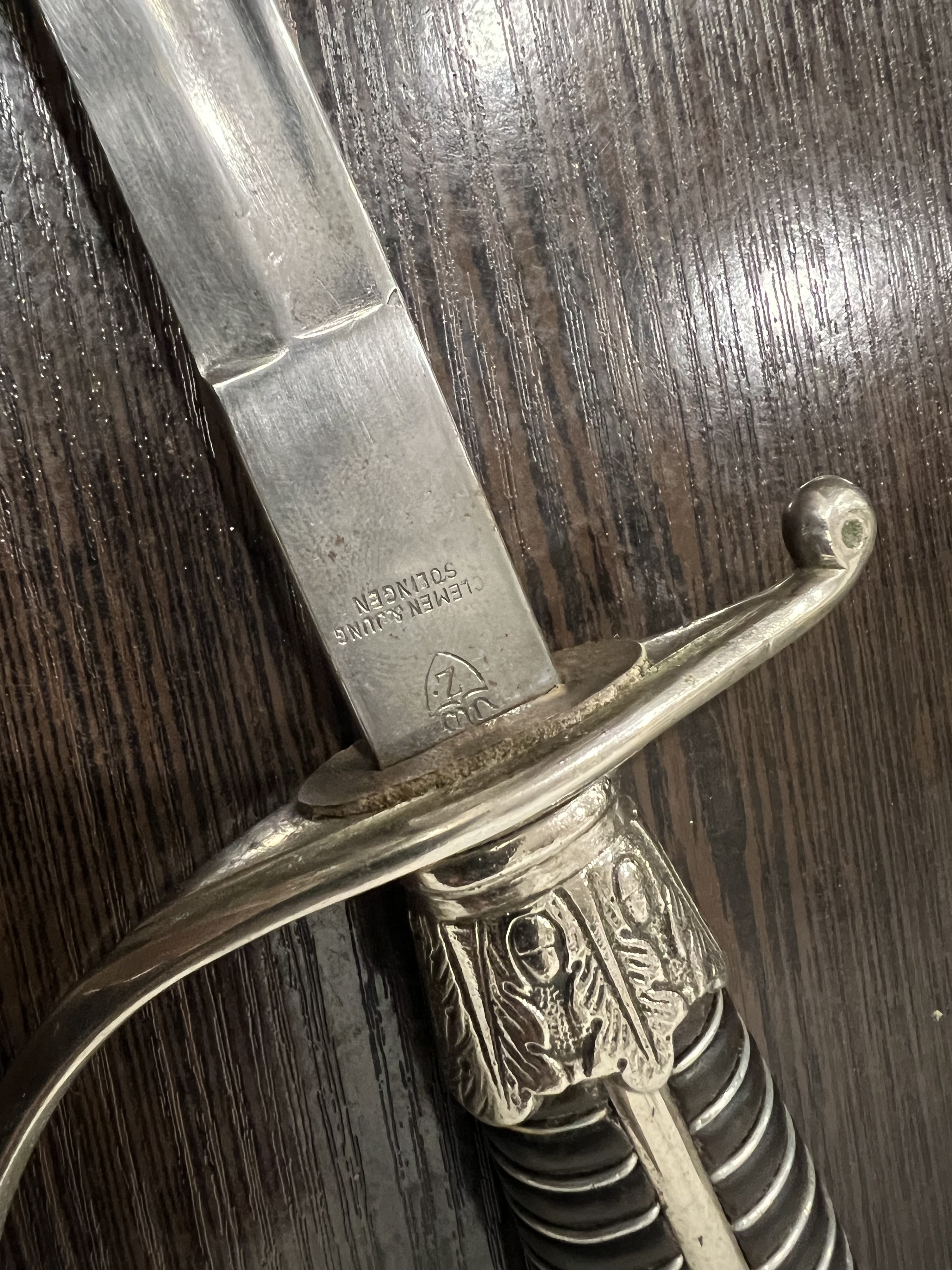 Я думаю оригинального в ней нет ни чего, навершие не оно, обратите внимание на его верх-нет опаясывающего кантика по верху,оно просто плоское и кривое,клинок без покрытия, клеймо нанесено на оборот, т.е. фирменный знак и надпись нужно поменять местами, так я видел на без вопросных палашах этого производителя.Гарда вся в кратерах под покрытием,такое обычно бывает при литье копий под давлением.Ножны не оригинал,отлиты вместе с кольцами! Длинное не моя тема,может у кого есть другое мнение.