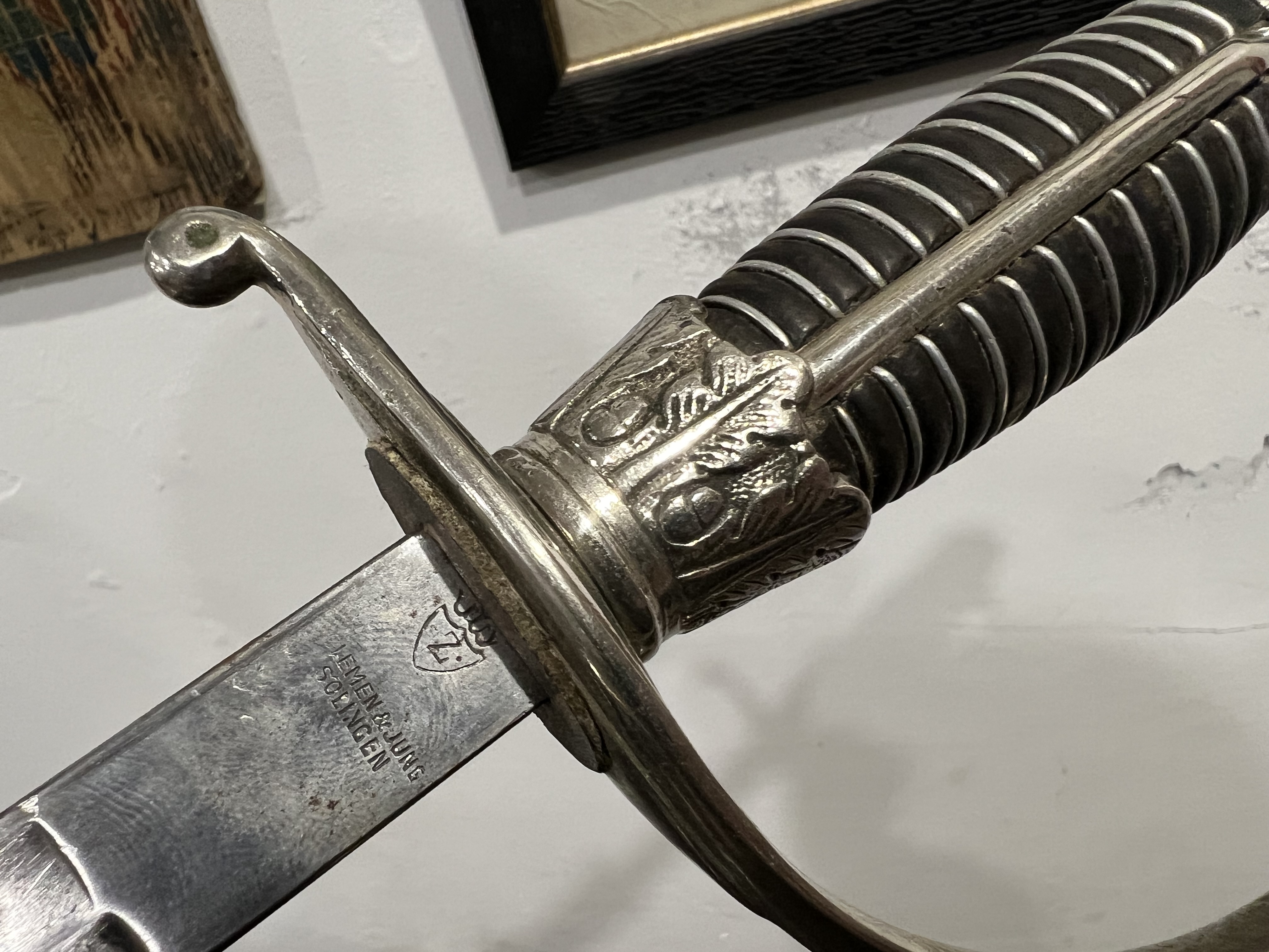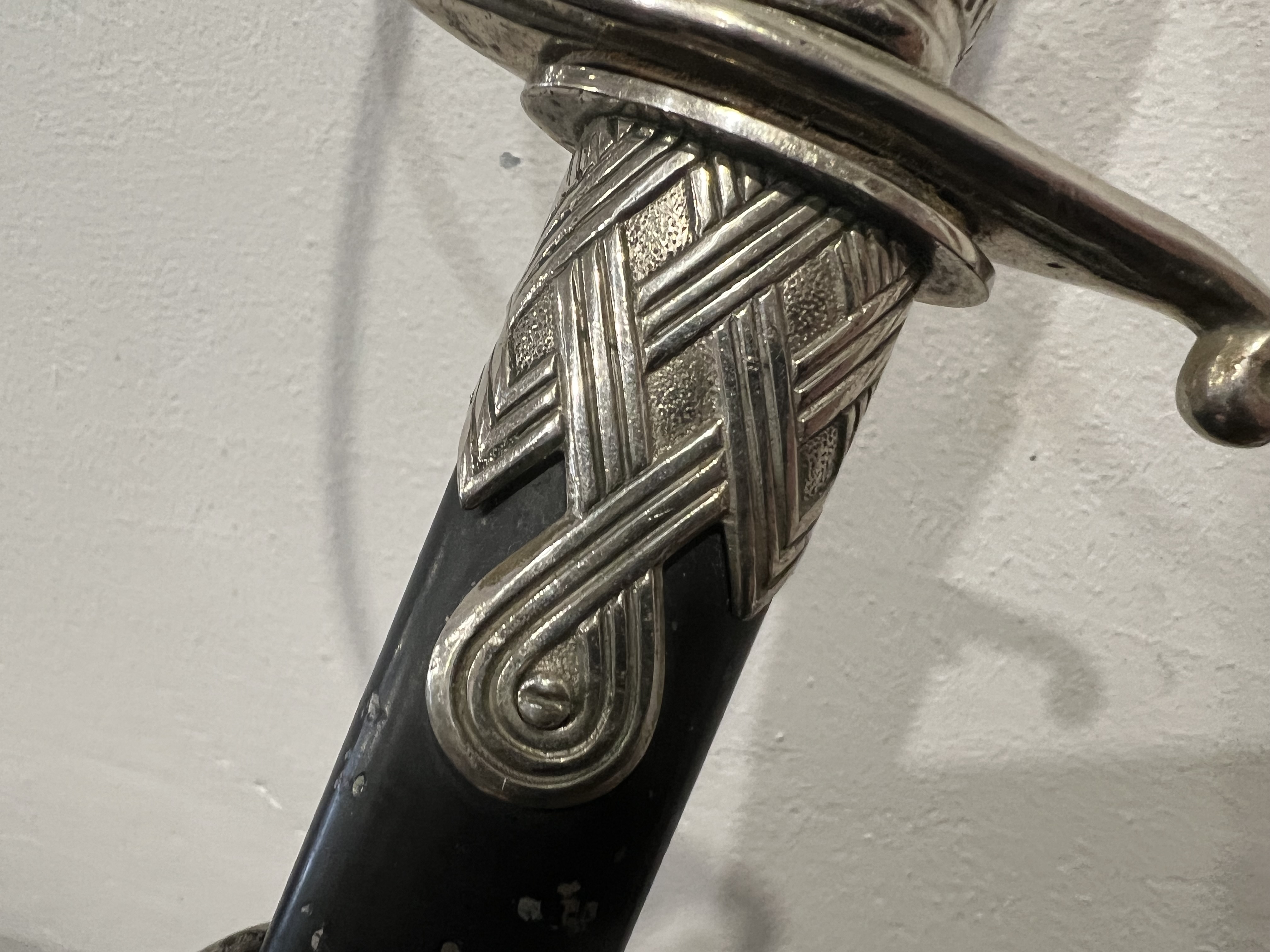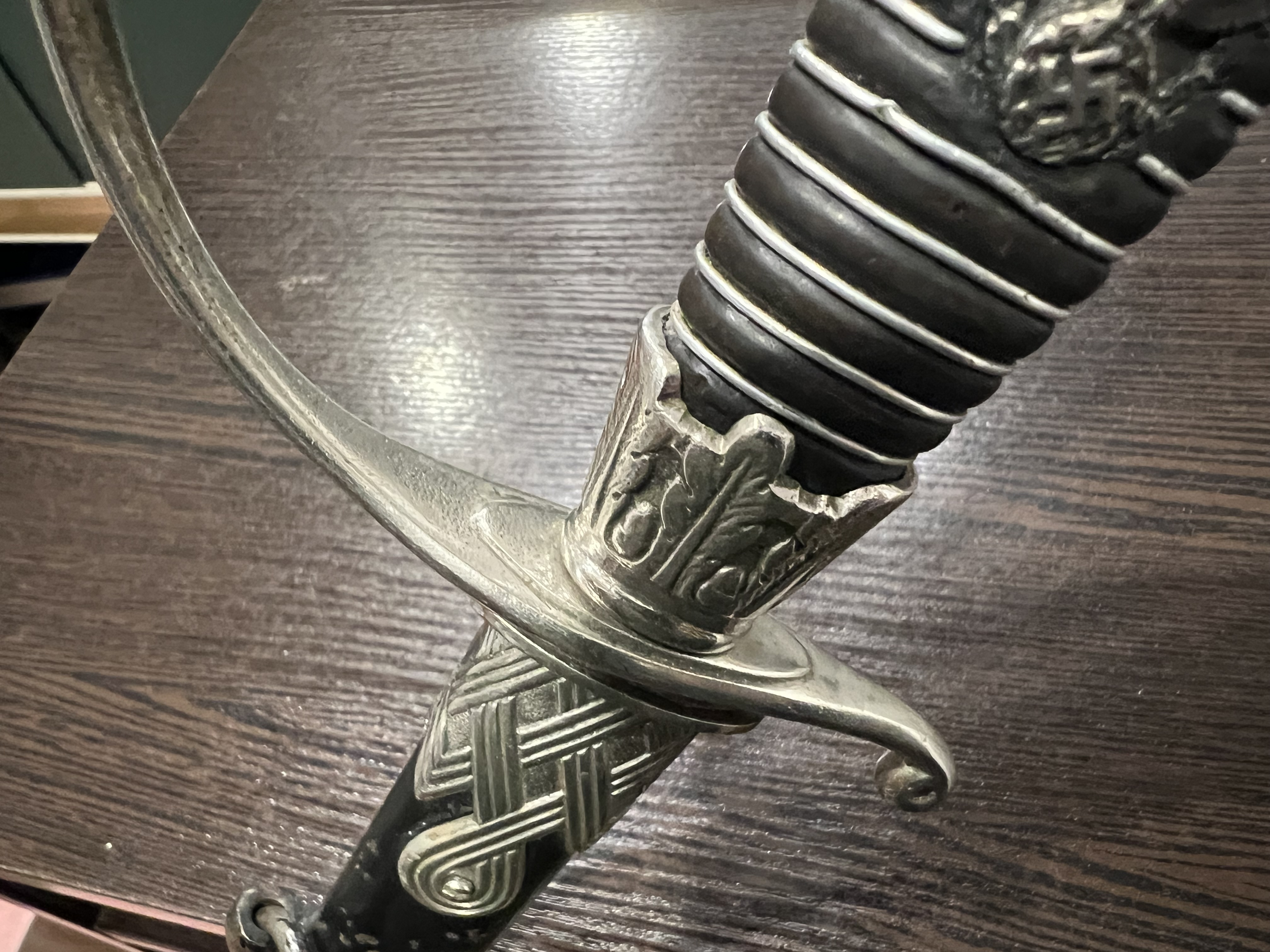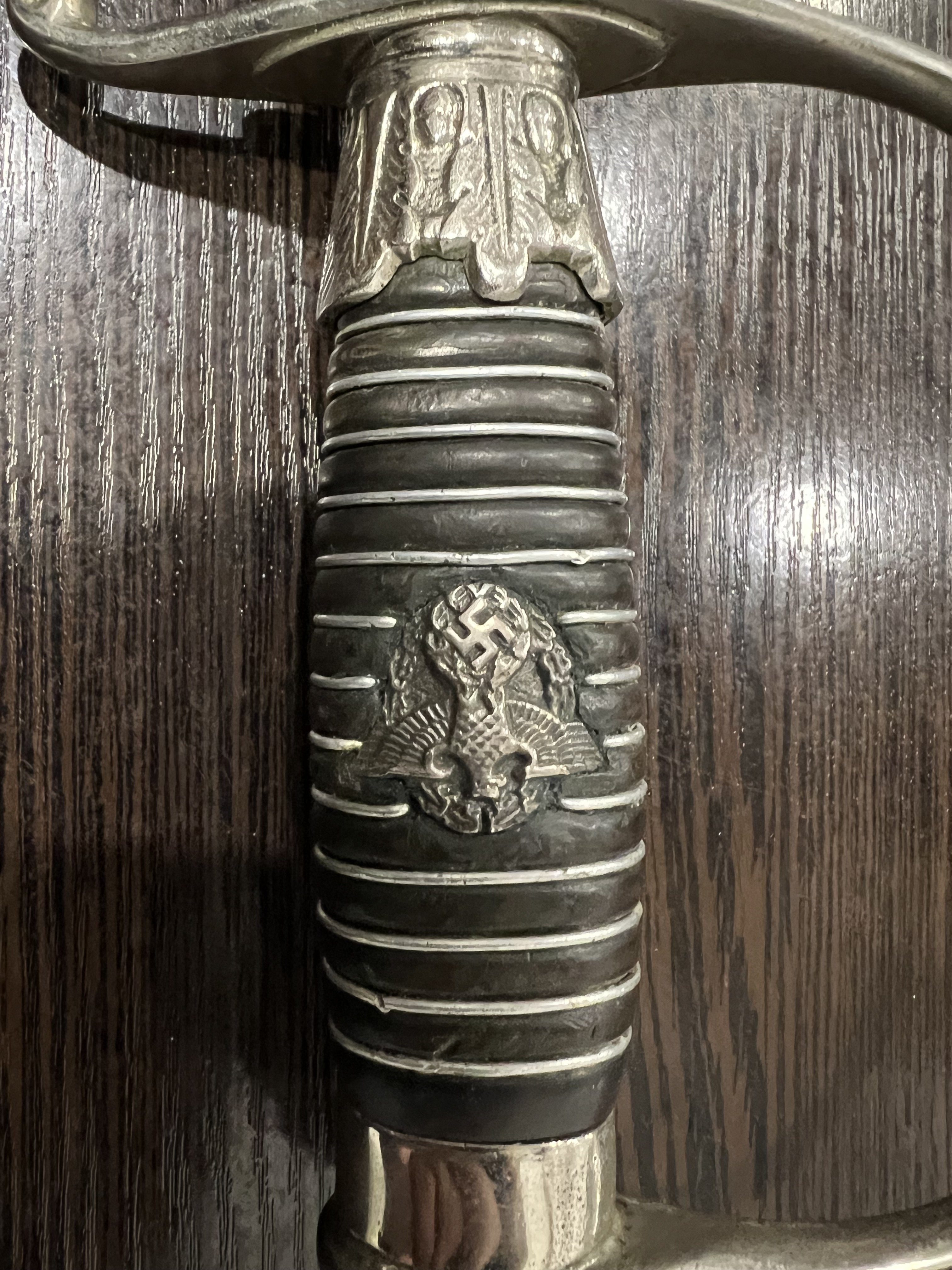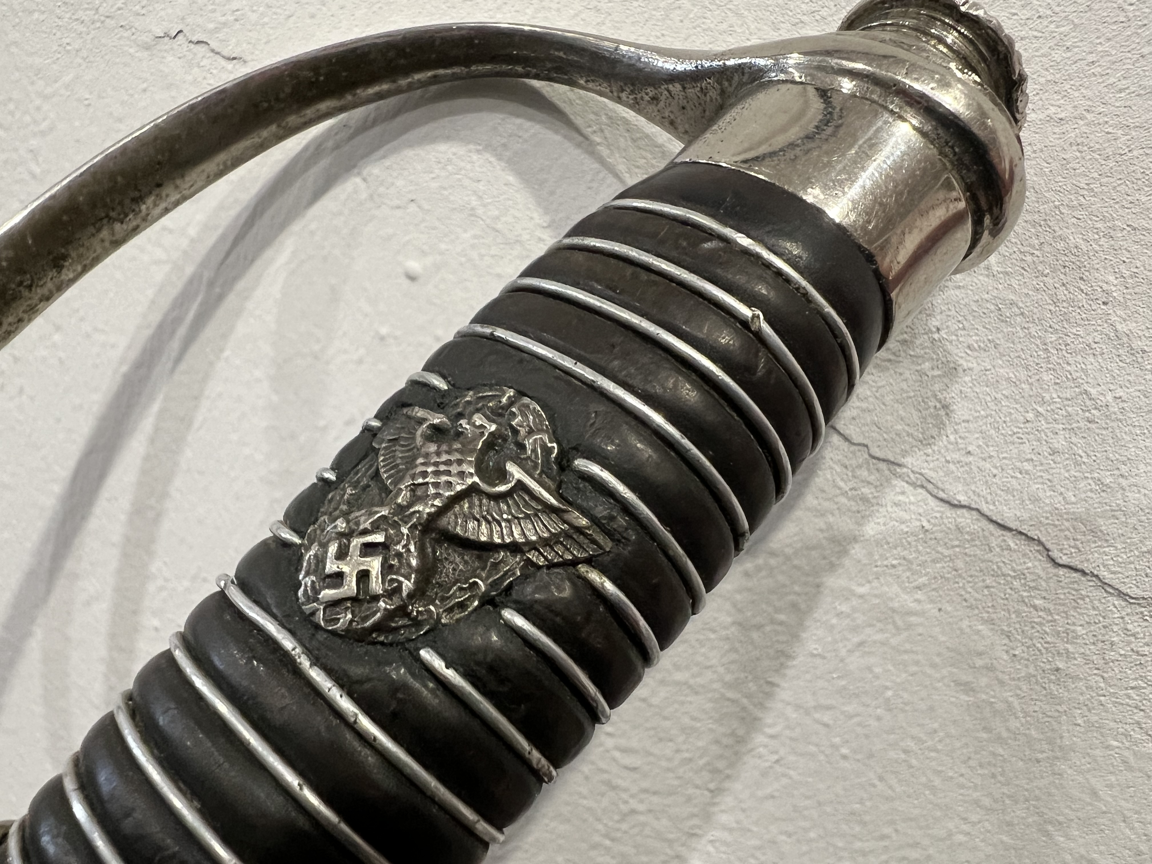 Я думаю оригинального в ней нет ни чего, навершие не оно, обратите внимание на его верх-нет опаясывающего кантика по верху,оно просто плоское и кривое,клинок без покрытия, клеймо нанесено на оборот, т.е. фирменный знак и надпись нужно поменять местами, так я видел на без вопросных палашах этого производителя.Гарда вся в кратерах под покрытием,такое обычно бывает при литье копий под давлением.Ножны не оригинал,отлиты вместе с кольцами! Длинное не моя тема,может у кого есть другое мнение.