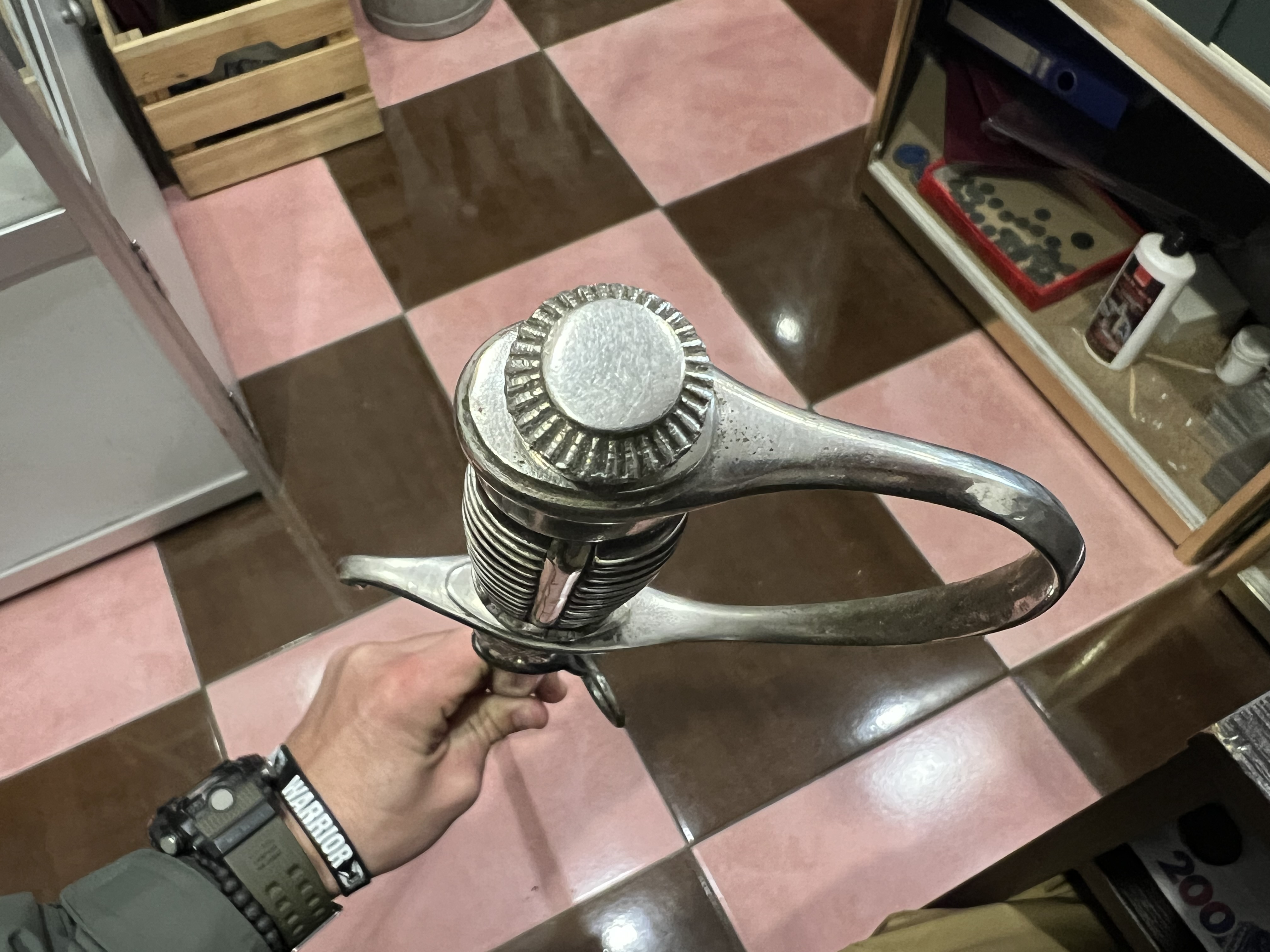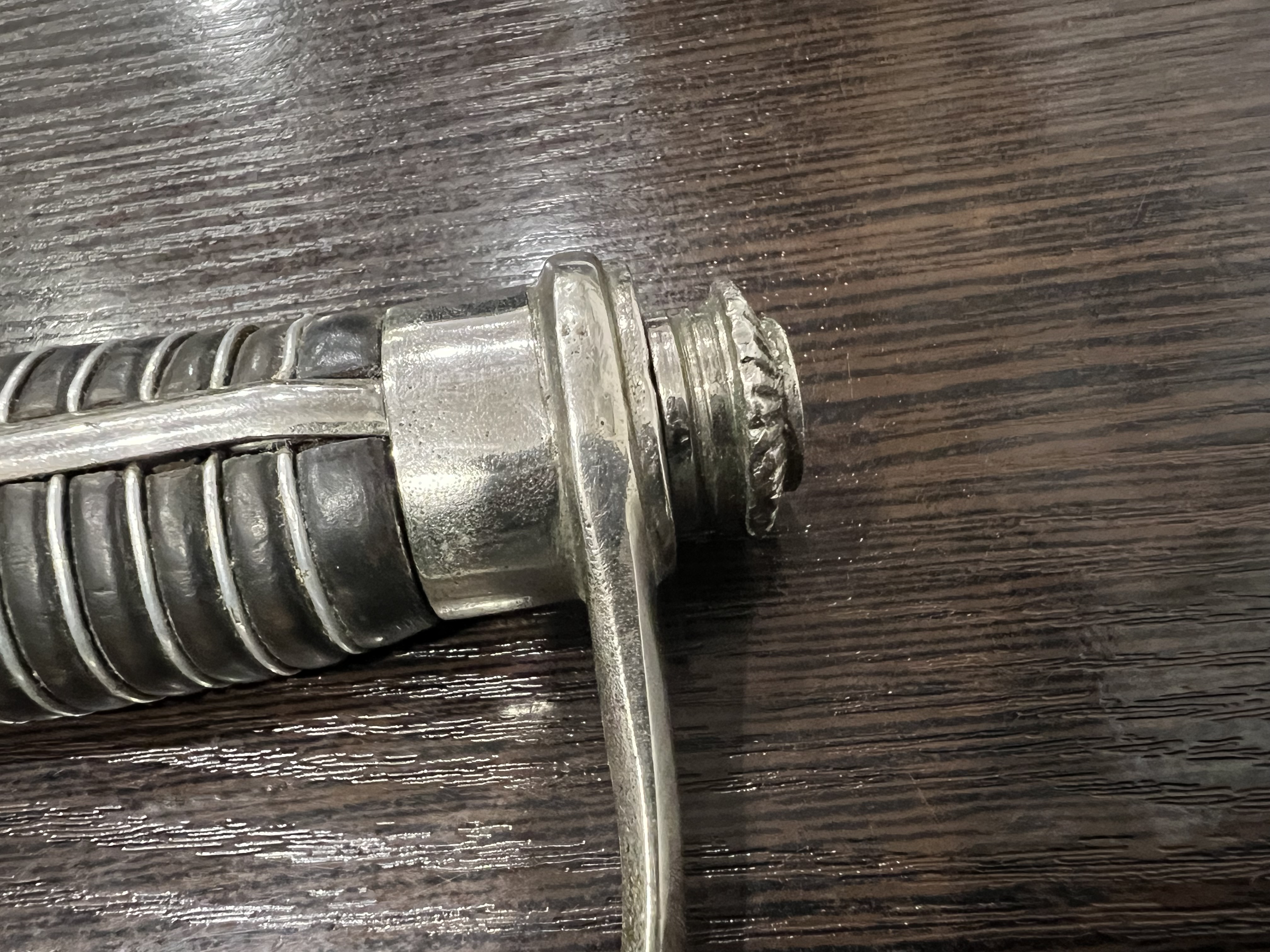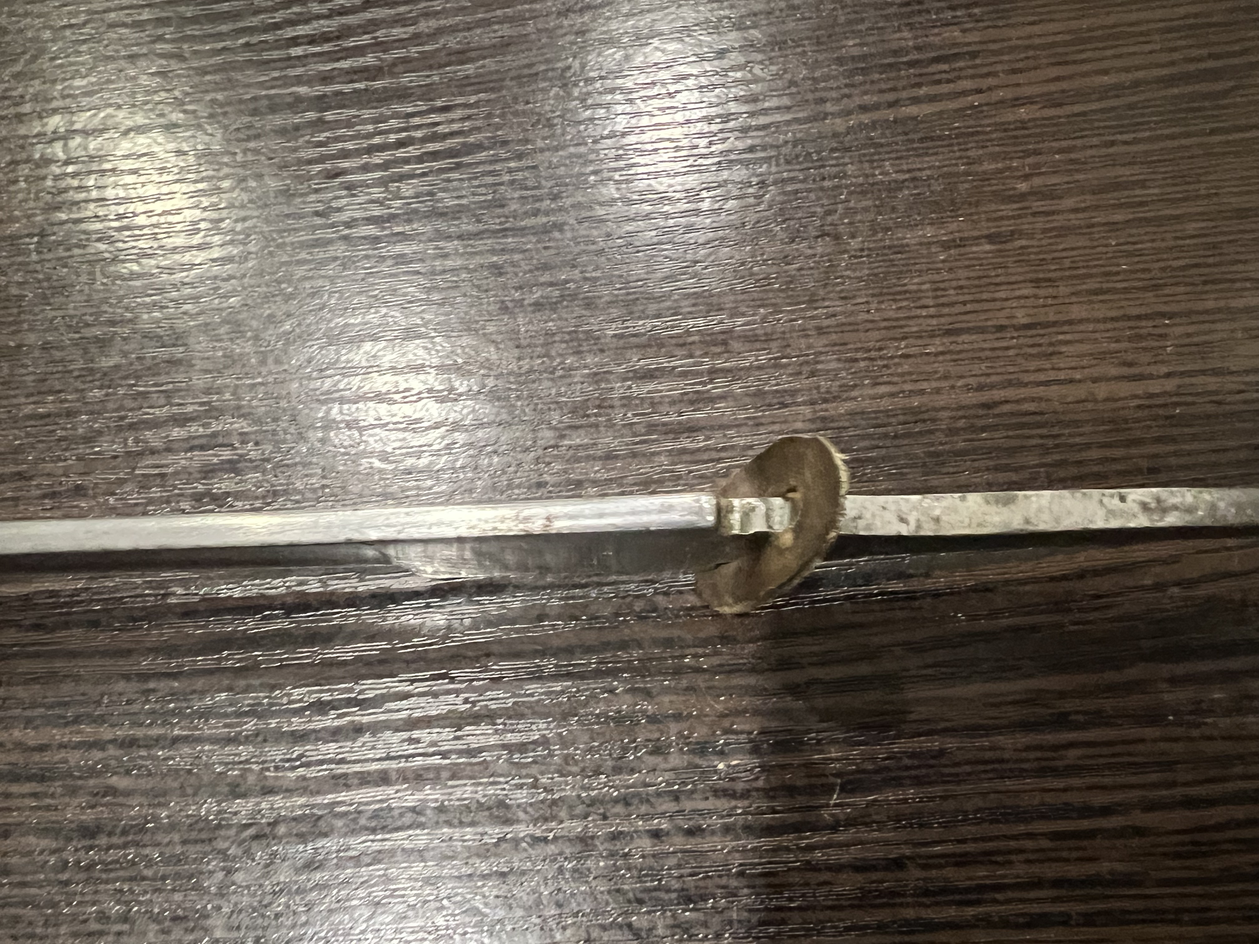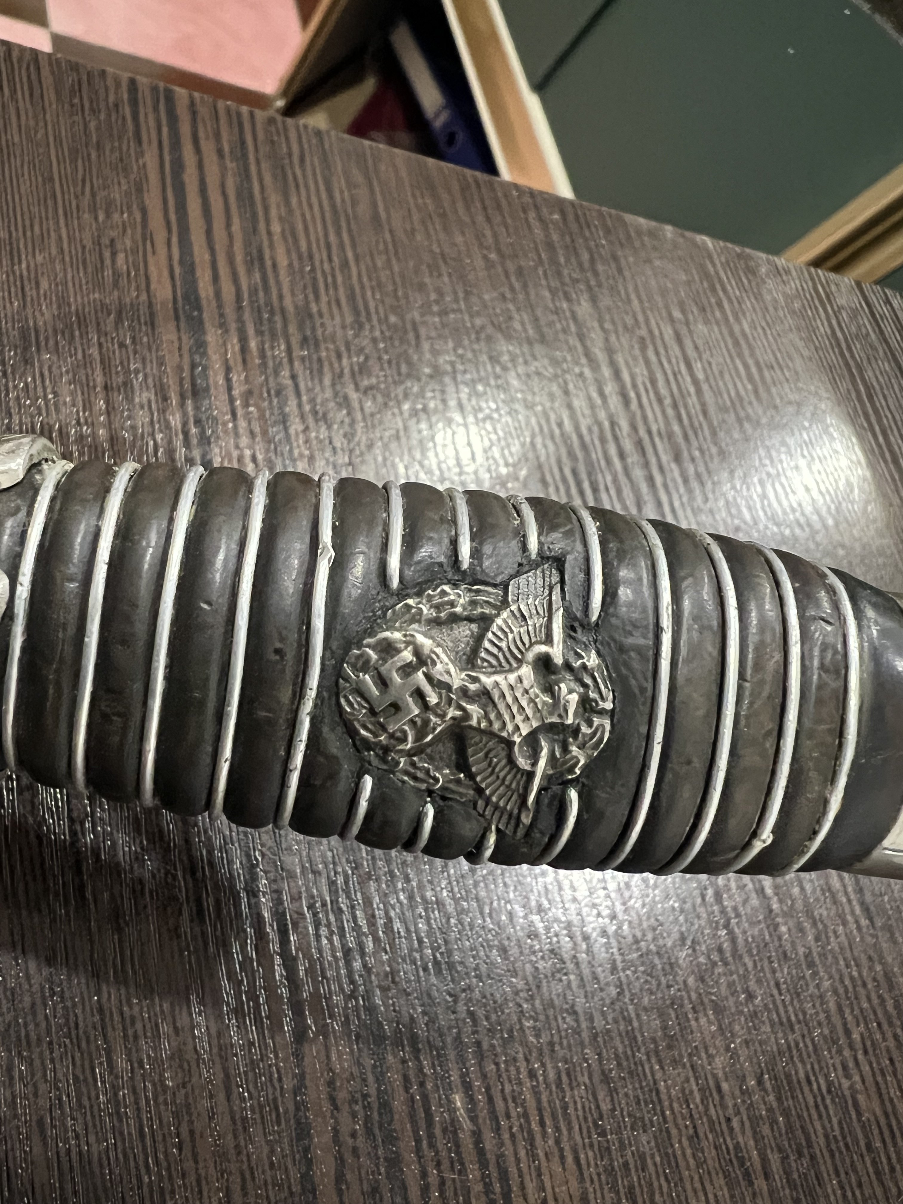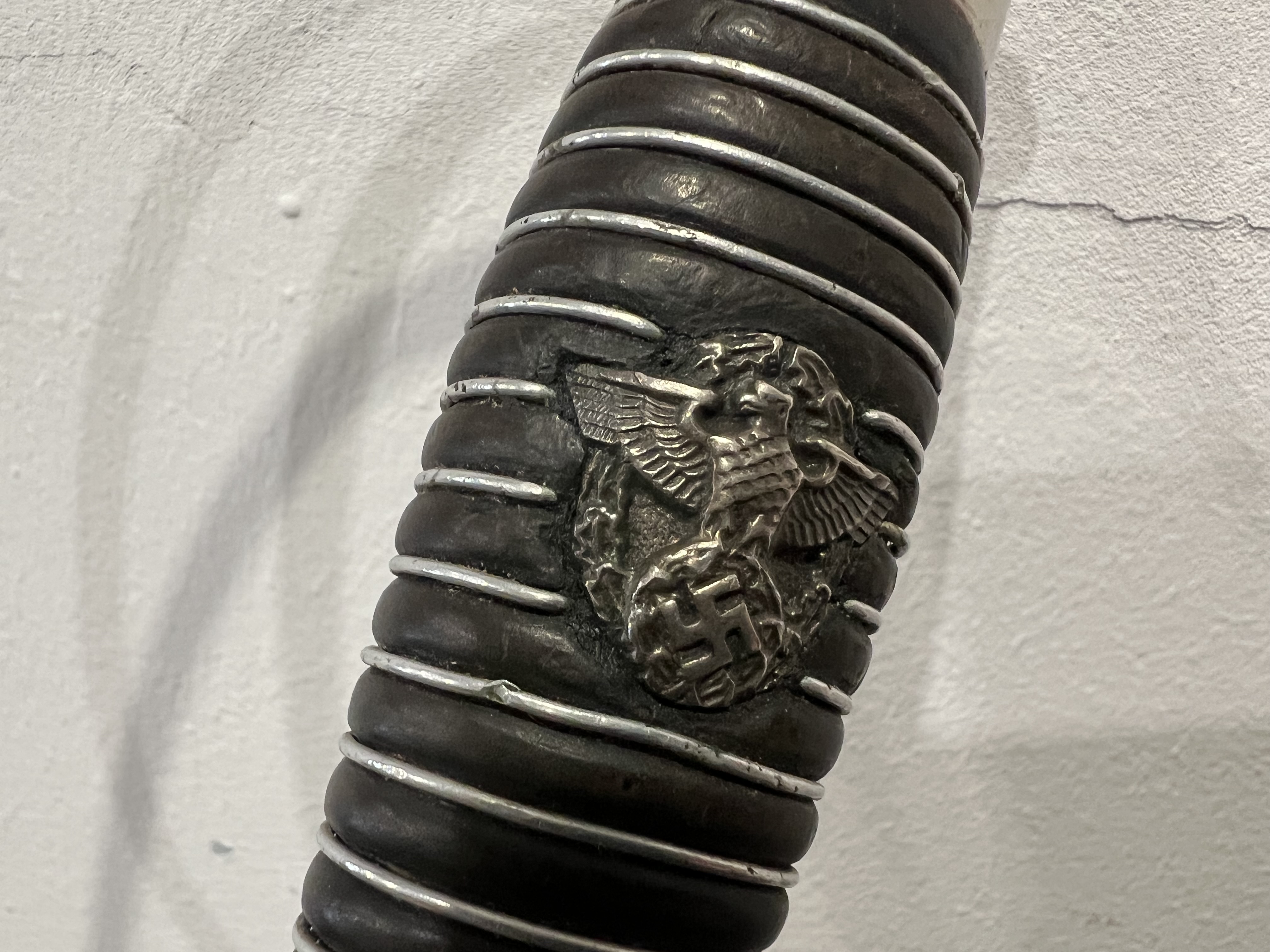 Я думаю оригинального в ней нет ни чего, навершие не оно, обратите внимание на его верх-нет опаясывающего кантика по верху,оно просто плоское и кривое,клинок без покрытия, клеймо нанесено на оборот, т.е. фирменный знак и надпись нужно поменять местами, так я видел на без вопросных палашах этого производителя.Гарда вся в кратерах под покрытием,такое обычно бывает при литье копий под давлением.Ножны не оригинал,отлиты вместе с кольцами! Длинное не моя тема,может у кого есть другое мнение.