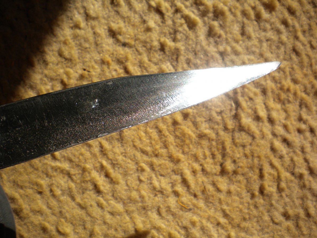 Игорь на твоем фото экспортный охотник(205),это не одно и то же.Ту Дима клин весь в никиле,следы правки видны по всей плоскости клинка,но все под покрытием!Потери минимальные никеля есть на рукояти и на кончике клинка,постарался показать на фото.При близком рассмотрении расклеп заклепок мне не видится родным.