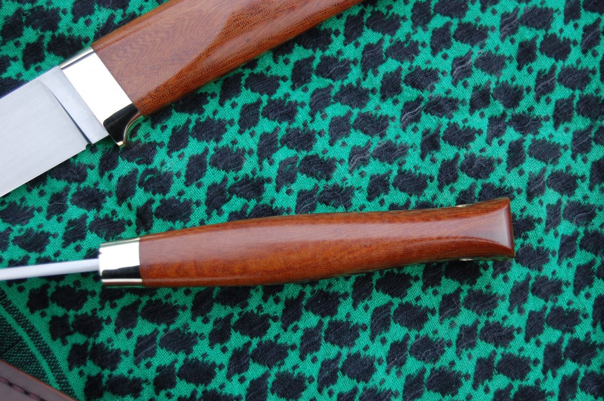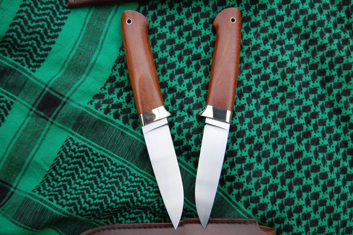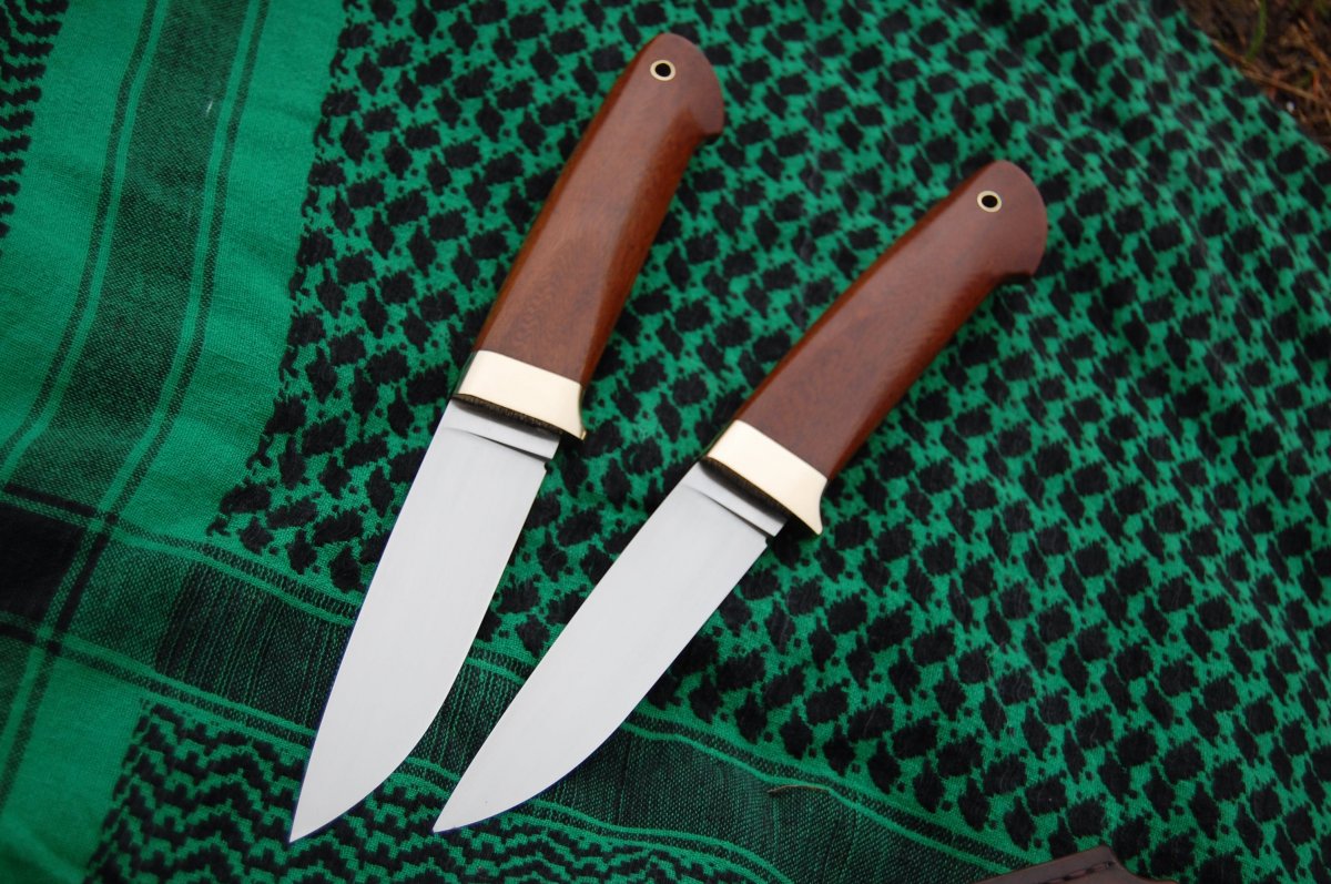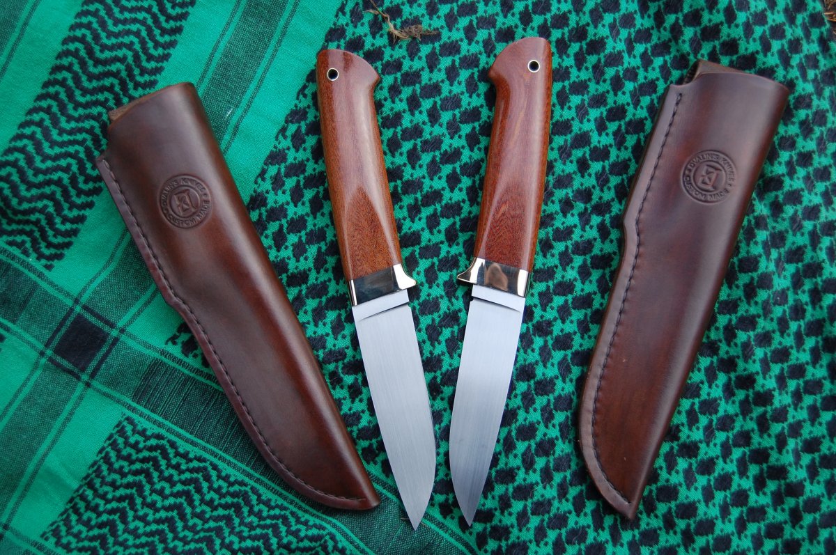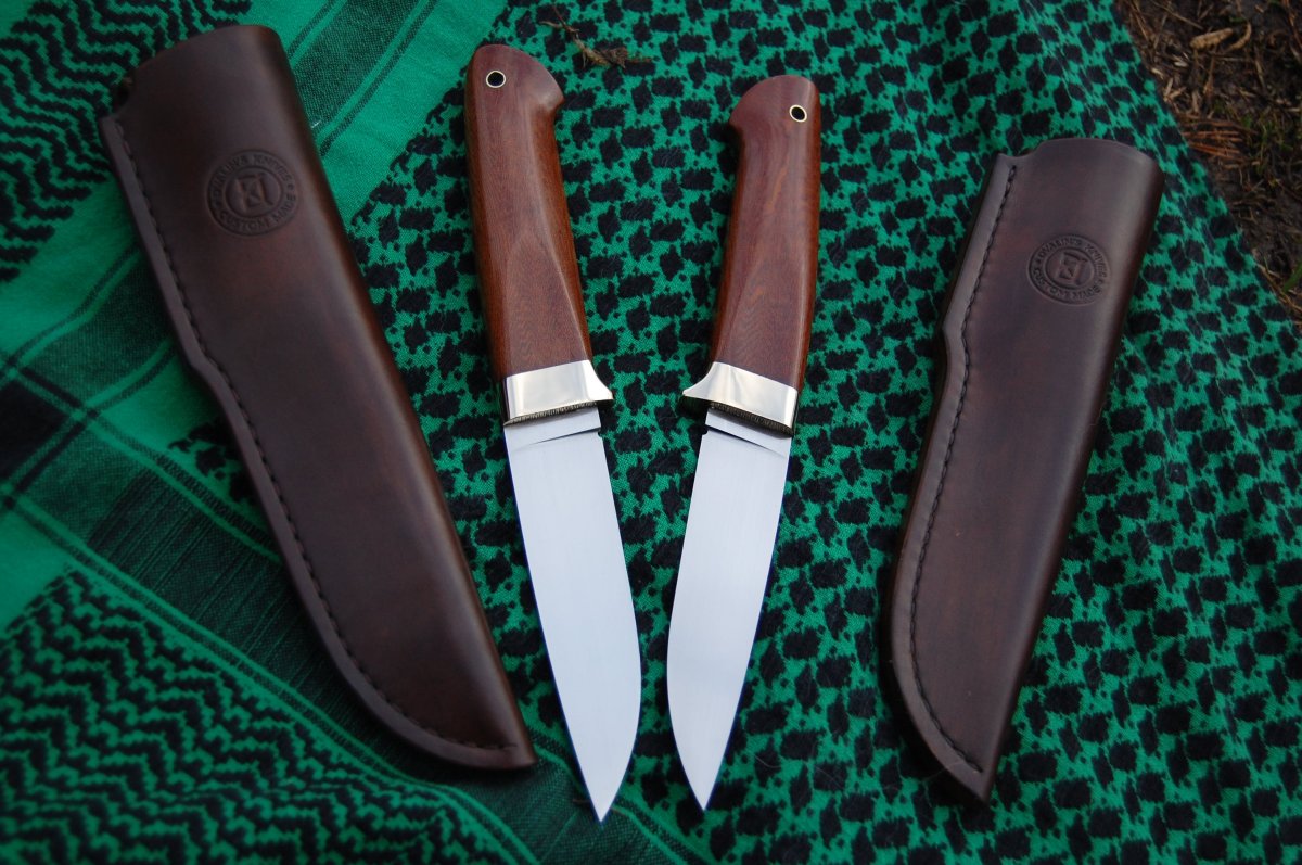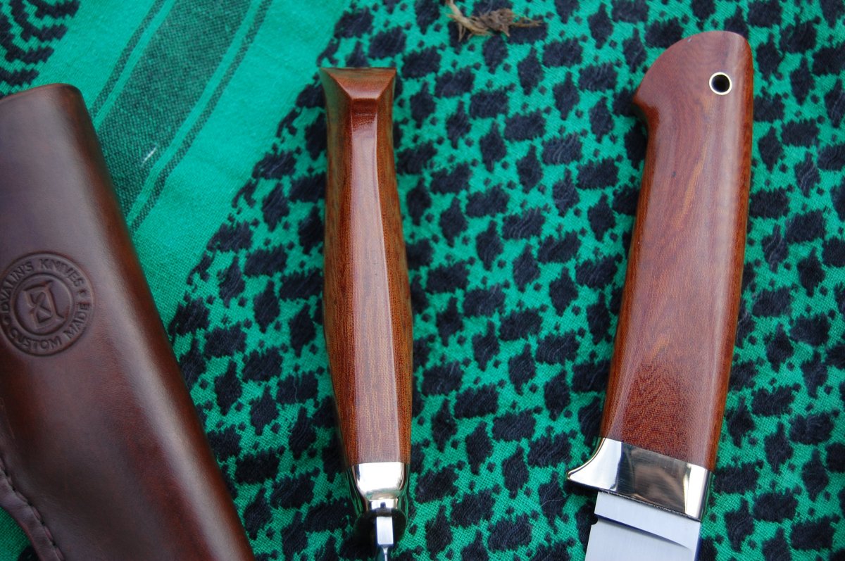 "Пара хантерів" клинки: сталь Х12МФ (60 HRC) габаритний розмір 115/27/4 мм больстер: бронза руків"я: текстоліт (круг) довжина 120 мм ножни: шкіра рослинного дублення ціна 2000 грн за штуку