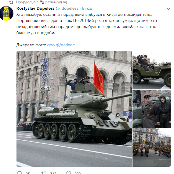 Нащо це, протиставлення? Ше пуйла на танку запостьте. Обговорення було самого факту параду, хто за , а хто ні., а цей репост- маніпулювання .