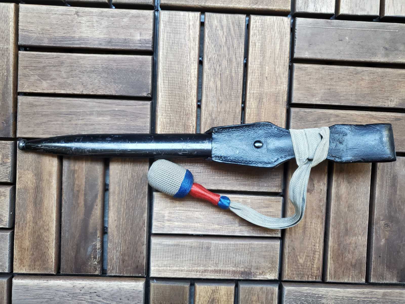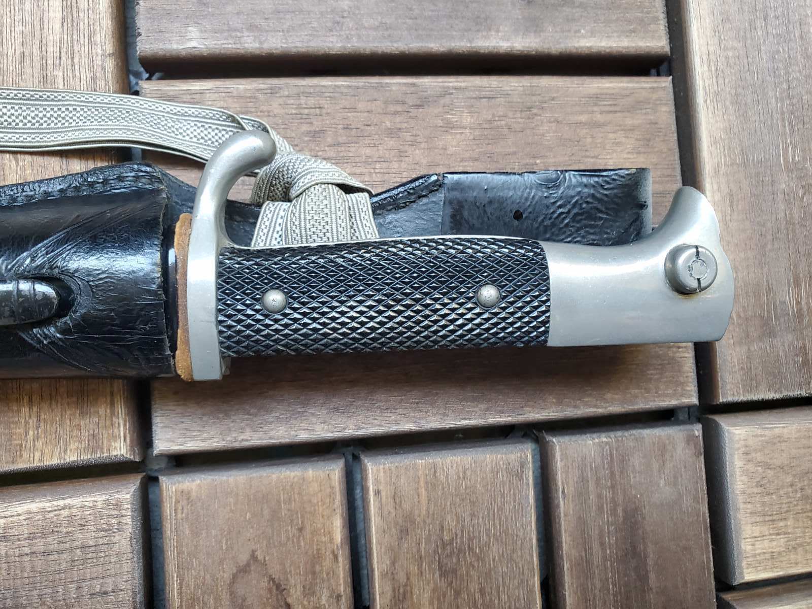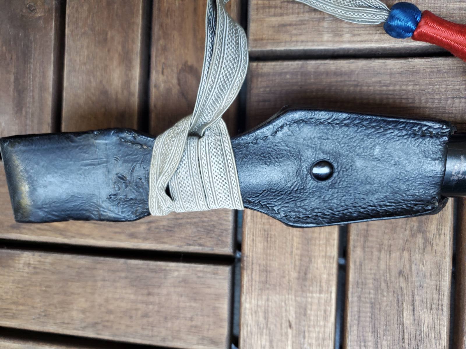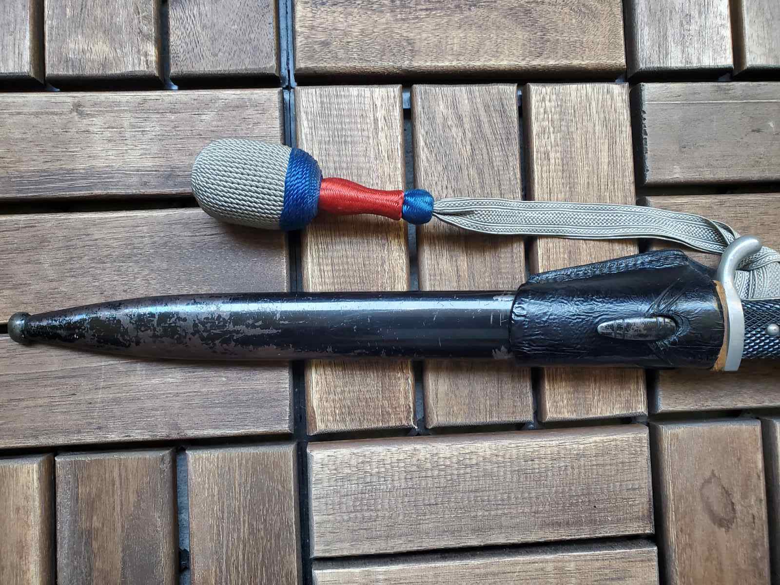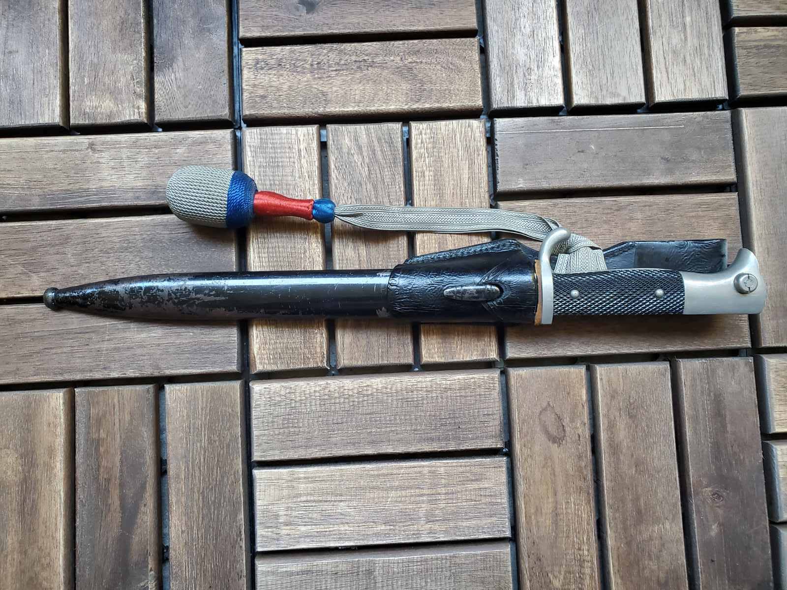 К штыку вопросов нет . А вот тредель и вкладыш по таким фотографиям , без следов бытования , подозрительные . Вкладыш может быть как брусочком так и свернутым в трубочку листом . Но если вынуть должна быть пыль и следы окисла ( голова штыка хромированная ) . Красный это пехота вермахта . Так же хорошо бы посмотреть следы на виниле под узлом темляка . Там рубчик от насечки или от ленты . Лента унтер ( рейхсвер или штаб ) , цвета темляка второй батальен восьмая рота . По таким фото выглядит как поздняя сборка но думаю это не критично .