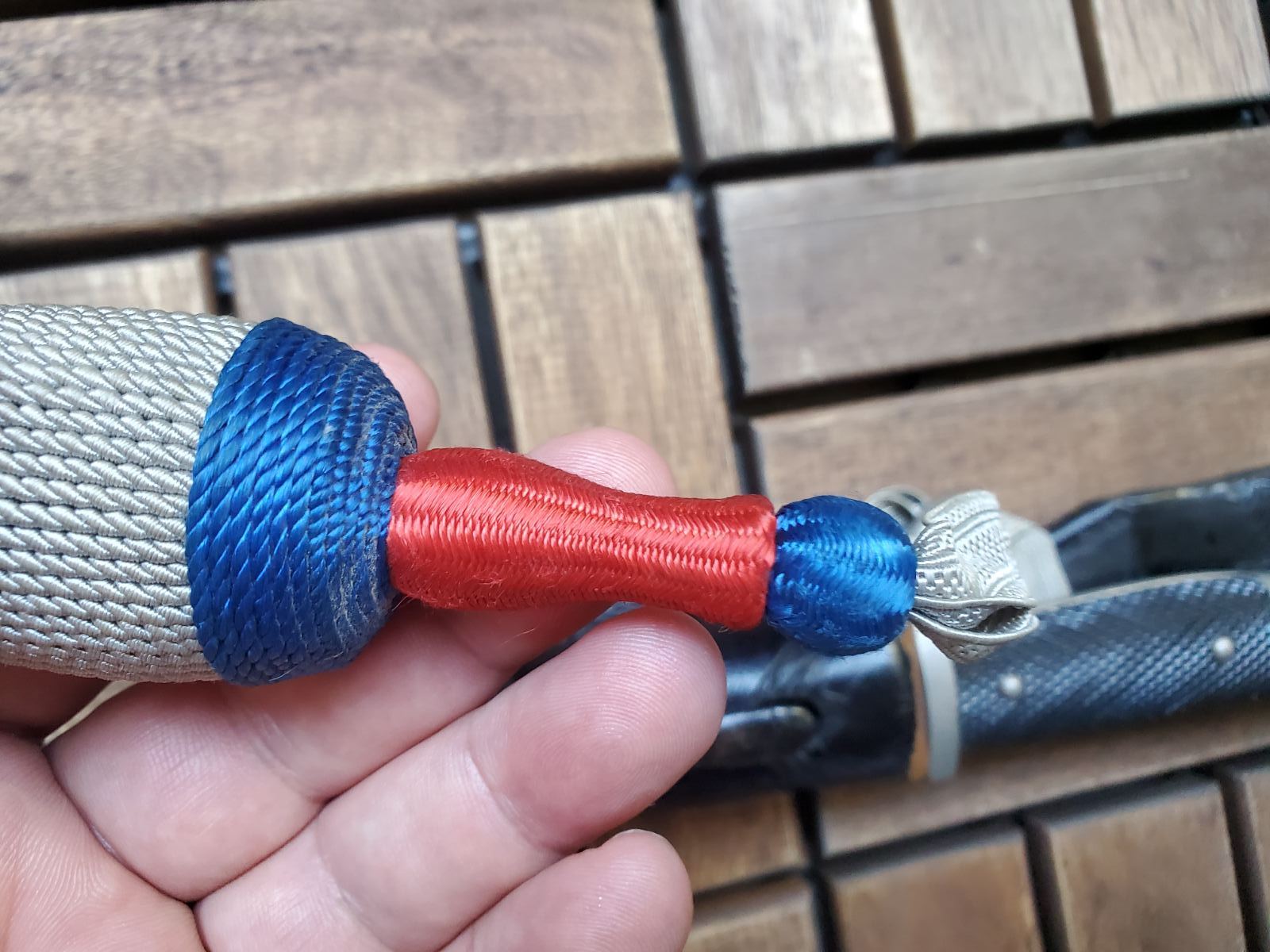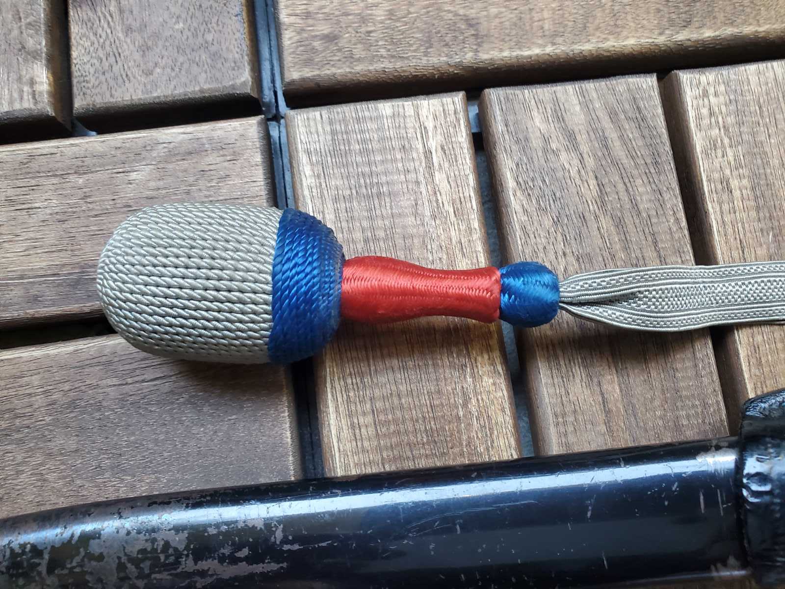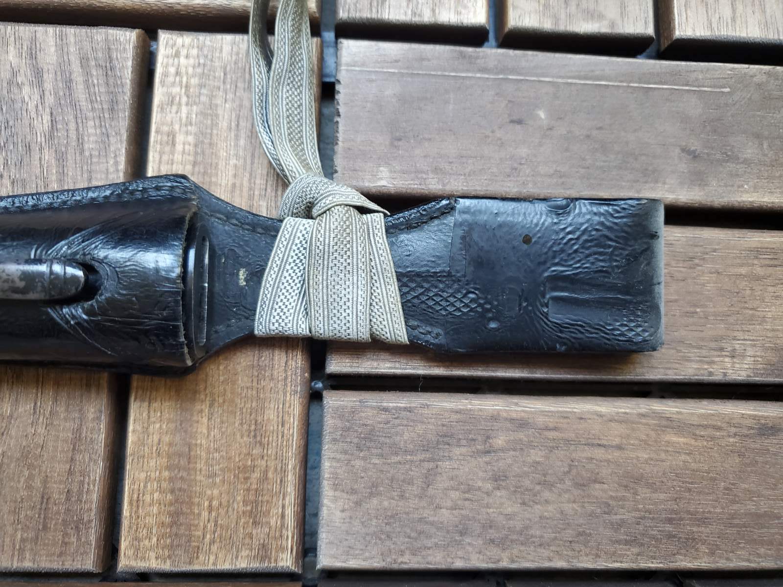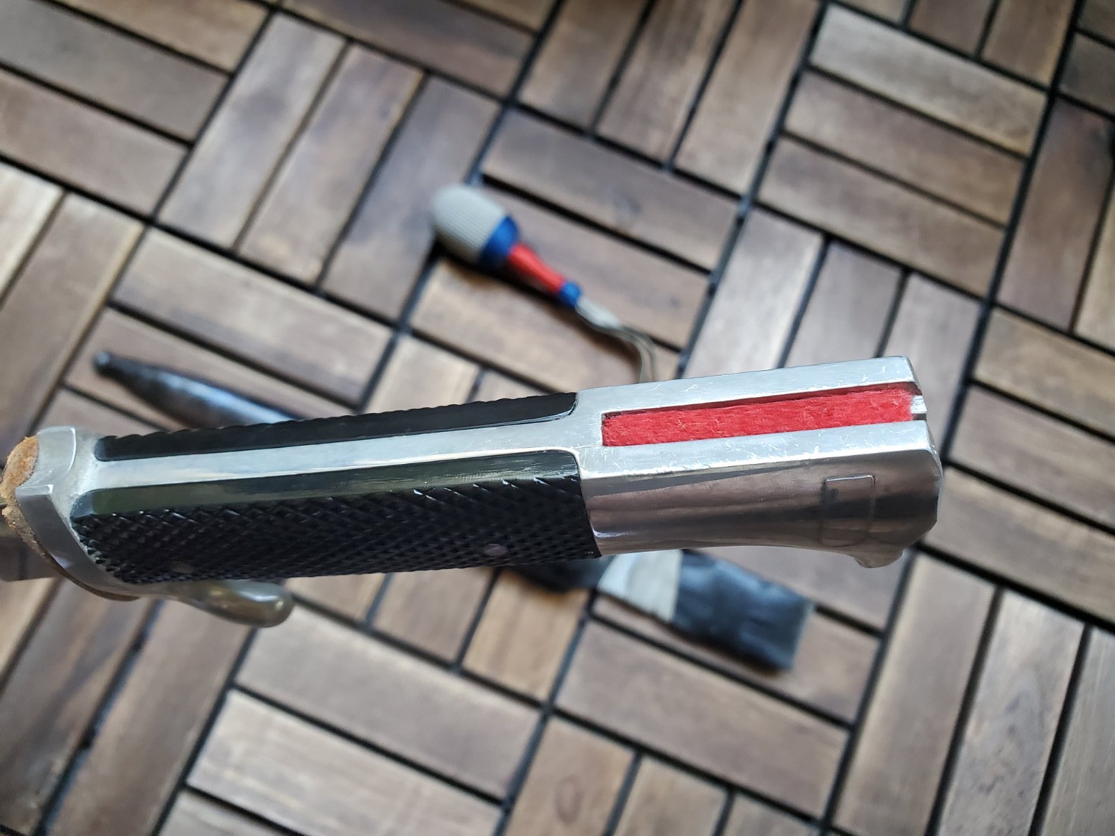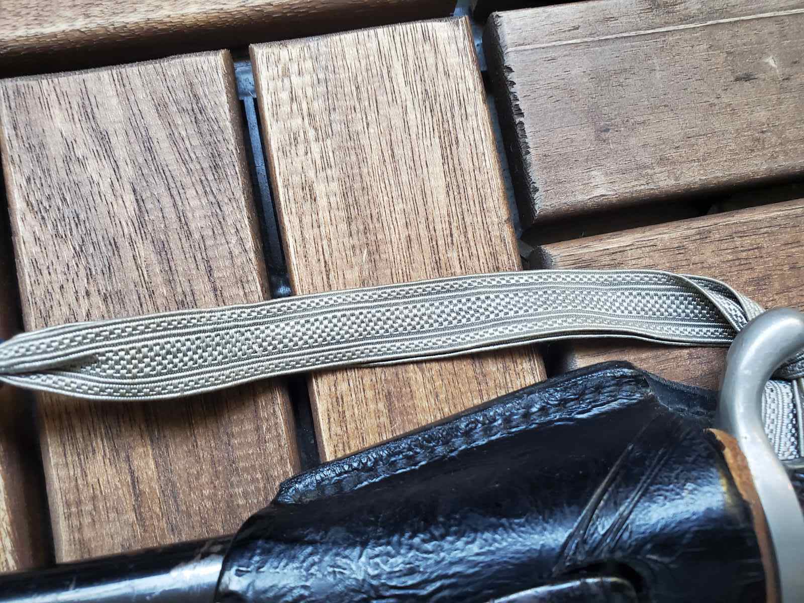 К штыку вопросов нет . А вот тредель и вкладыш по таким фотографиям , без следов бытования , подозрительные . Вкладыш может быть как брусочком так и свернутым в трубочку листом . Но если вынуть должна быть пыль и следы окисла ( голова штыка хромированная ) . Красный это пехота вермахта . Так же хорошо бы посмотреть следы на виниле под узлом темляка . Там рубчик от насечки или от ленты . Лента унтер ( рейхсвер или штаб ) , цвета темляка второй батальен восьмая рота . По таким фото выглядит как поздняя сборка но думаю это не критично .