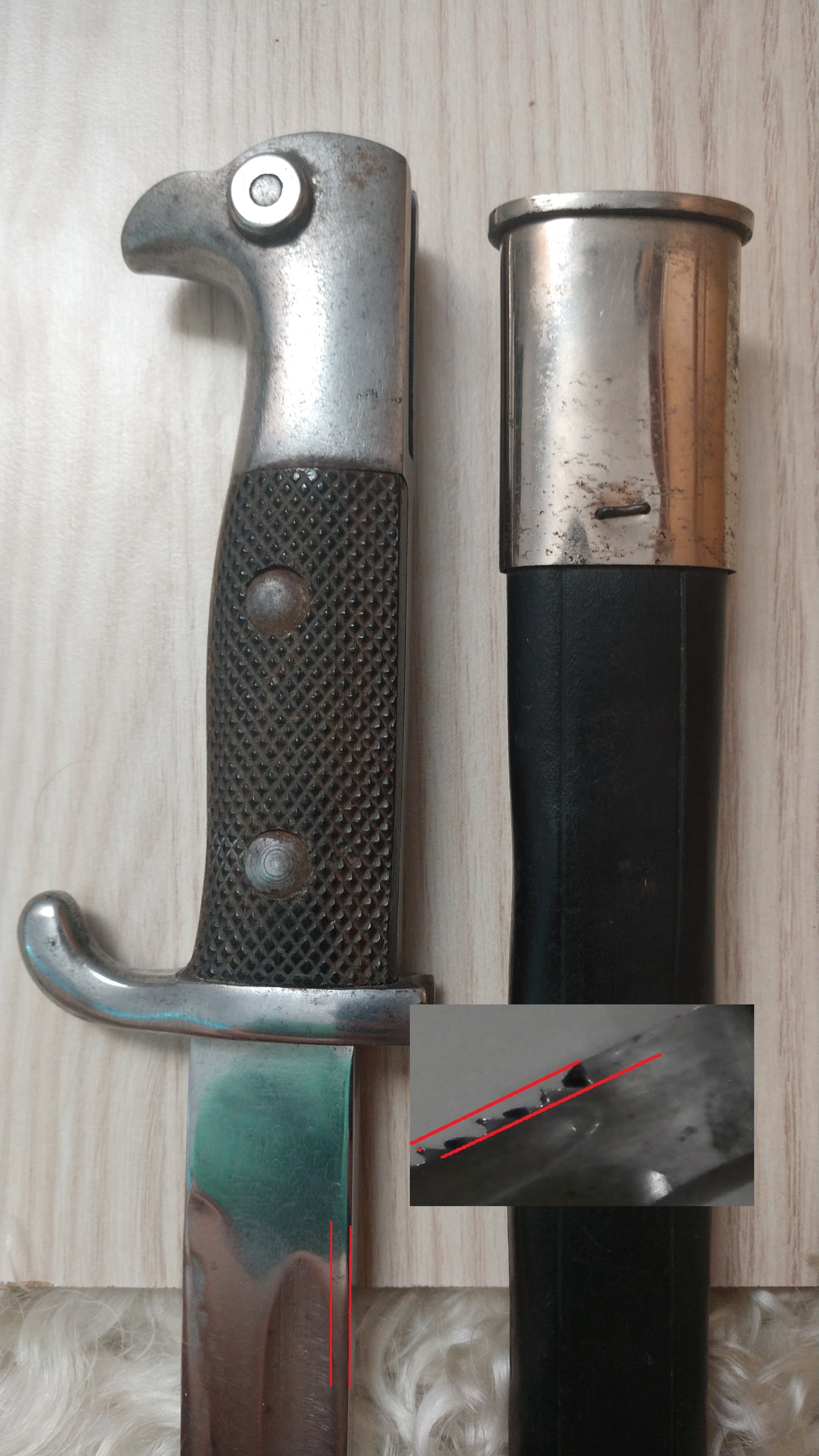 Zdes nebyla pila spilena, etovo styka klinok nacinal zizn kak normalnij bez pily. I zaba v reale dlja Feuerwehr Faschinenmesser vozmozno iz perioda 30tych let, na vtorom pokazanom styku podves reprodukcia realno, ili jevo probili nitockami.
