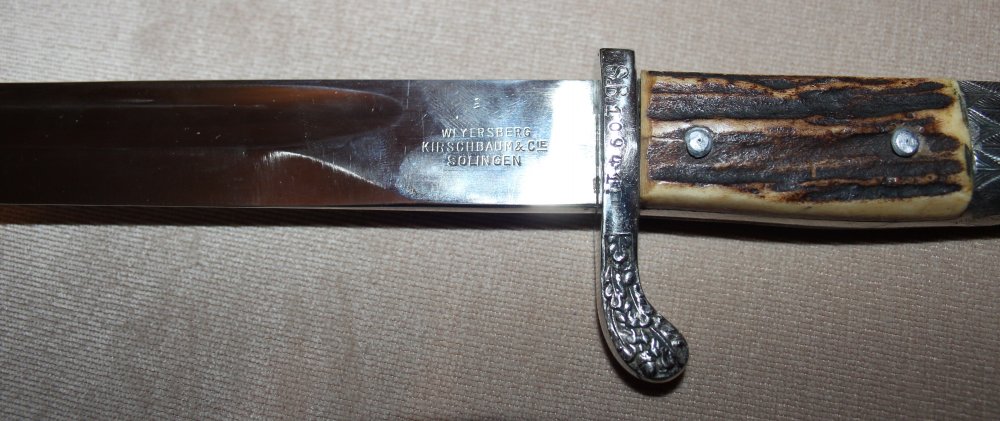 Не всё, конечно. Штык служебный. Переделан из Веймарского. Предполагаю, что на обухе клинка имеется клеймо в виде "паучка". Штамп на ножнах говорит о принадлежности к Schutzpolizei Königsberg, штамп на штыке-о принадлежности к Schutzpolizei Berlin. Непарность у таких штыков очень сильно влияет на цену. Цену я озвучить не берусь.