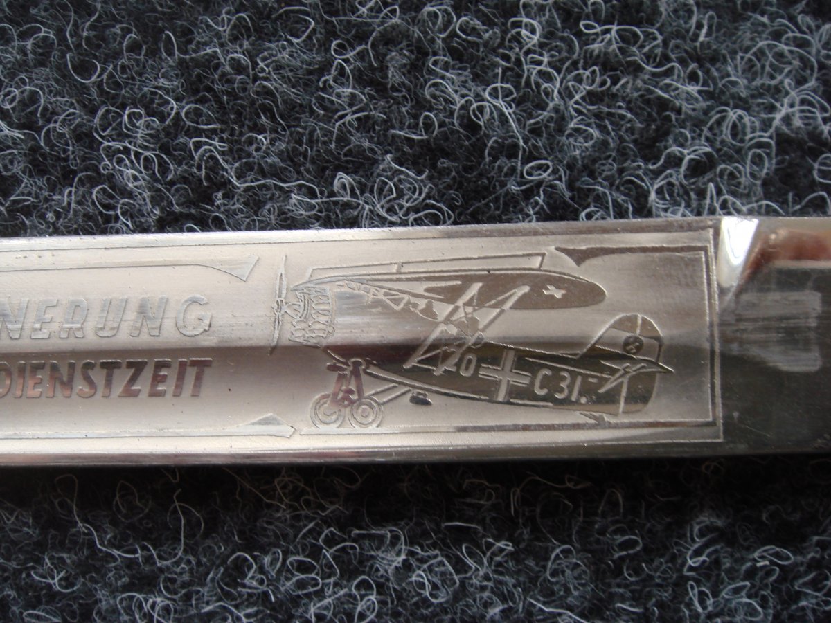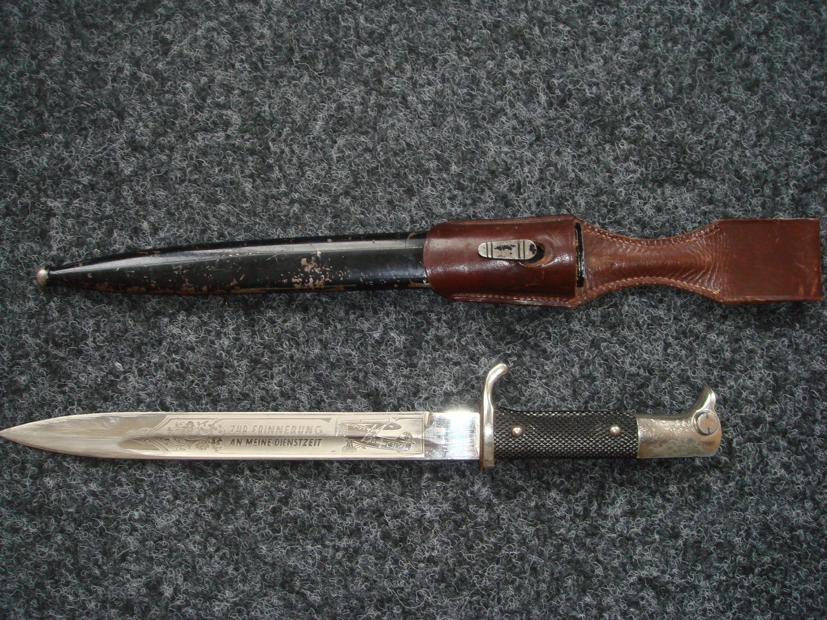 Моё мнение травление оригинальное, накладки возможно менялись. Хотя на других форумах были обсуждения, что и у Пака были заклёпки на поздних предметах. Штык редкий, изображён самолёт разведчик, описание есть у Текета. Фото моего.