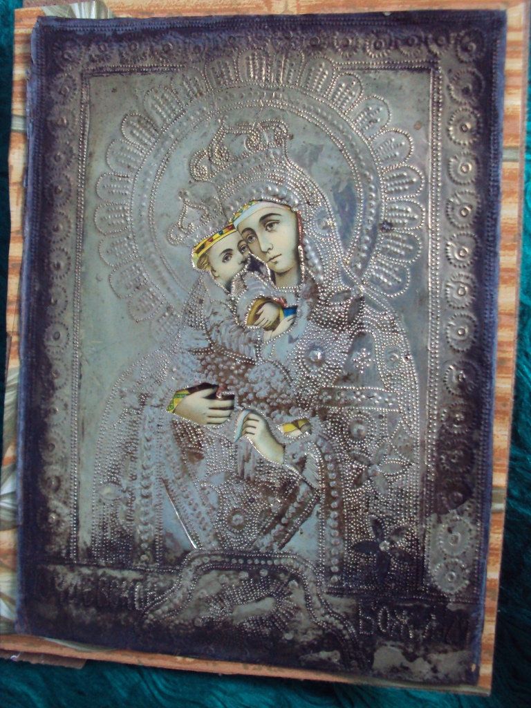 В заброшенной хате нашел... Литография + фольга. Похоже , что горела... или под ней лампадка стояла..( немного от накипи отмыл..) Рамка была убитая - пришлось выкинуть..