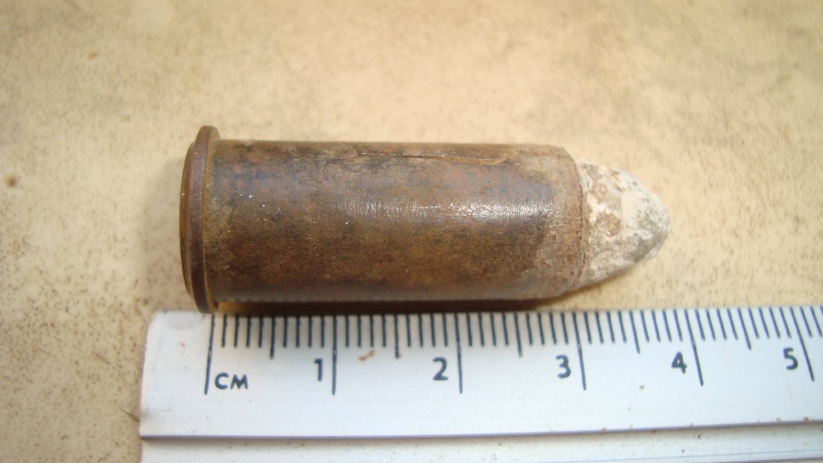 Видно,що довжина гільзи приблизно 30мм...Поміряйте будь-ласка штангенциркулем диаметр кулі біля основи.Здалеку нагадує боєприпас до Верндля,але закороткий..,може до старого револьвера?..