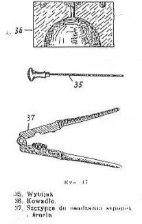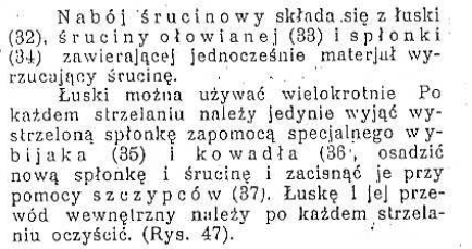 Так там же в описі все є. "Набій дробовий складається з гільзи, свинцевої дробини і капсуля, що містить одночасно матеріал до викиду дробини. Гільзи можна вживати багаторазово. Після кожного пострілу належить видалити вистрелений капсуль з допомогою спеціальної викототки і ковадла." І намальований на малюнку .32 набій (крайній справа) якраз є аналогічним знайденому Вами- спеціально заштриховане "тіло" патрона, щоб було видно, що то саме суцільна болванка з просверленим отвором,на відміну від крайнього зліва патрона, де чітко видно стінки гільзи і її вміст. Тобто бачимо два типи ізбових чи дробових набоїв- виготовлений зі стандартної гільзи з вкладишем- трубкою, і цільноточений з просвердленим отвором.