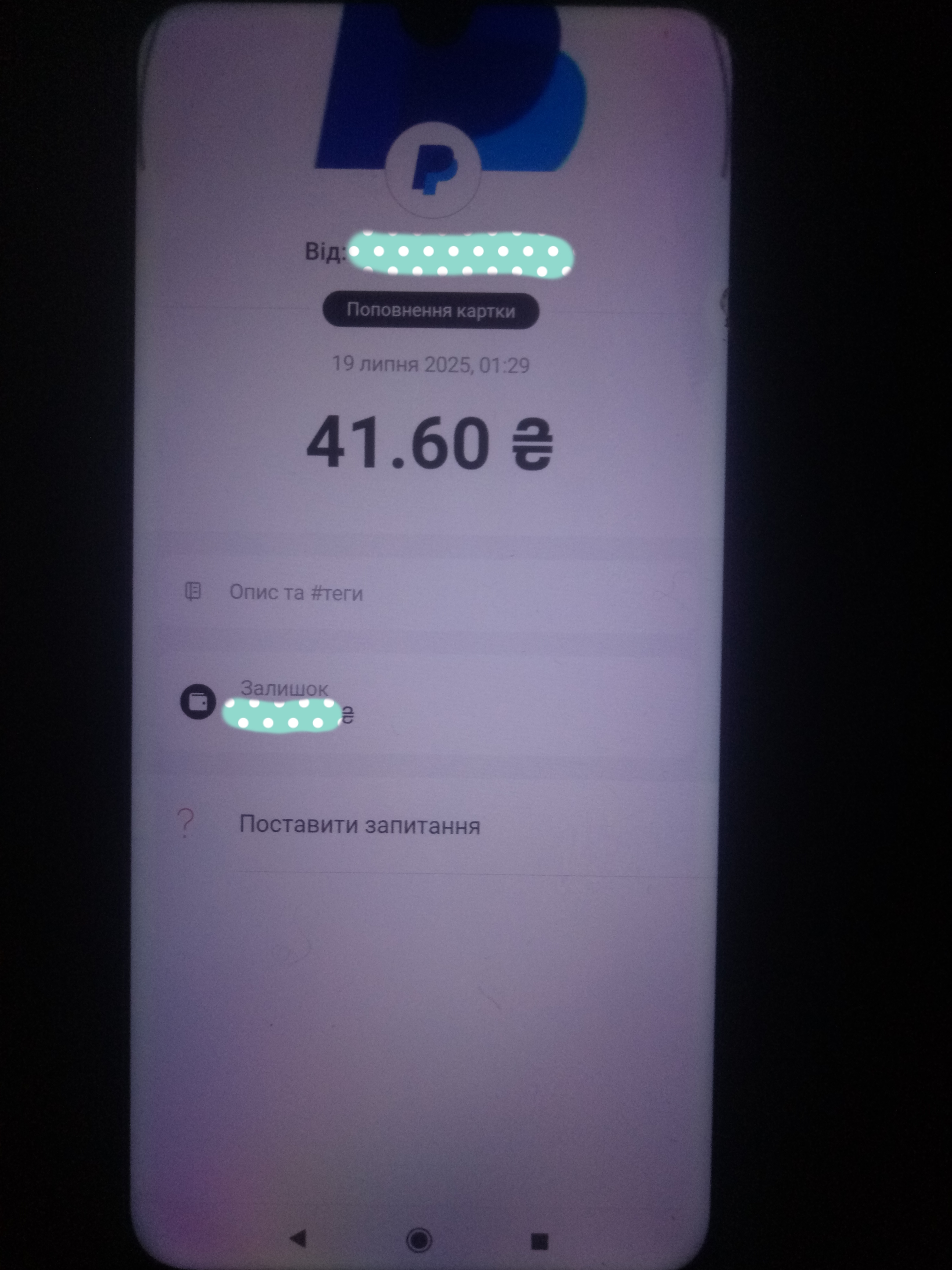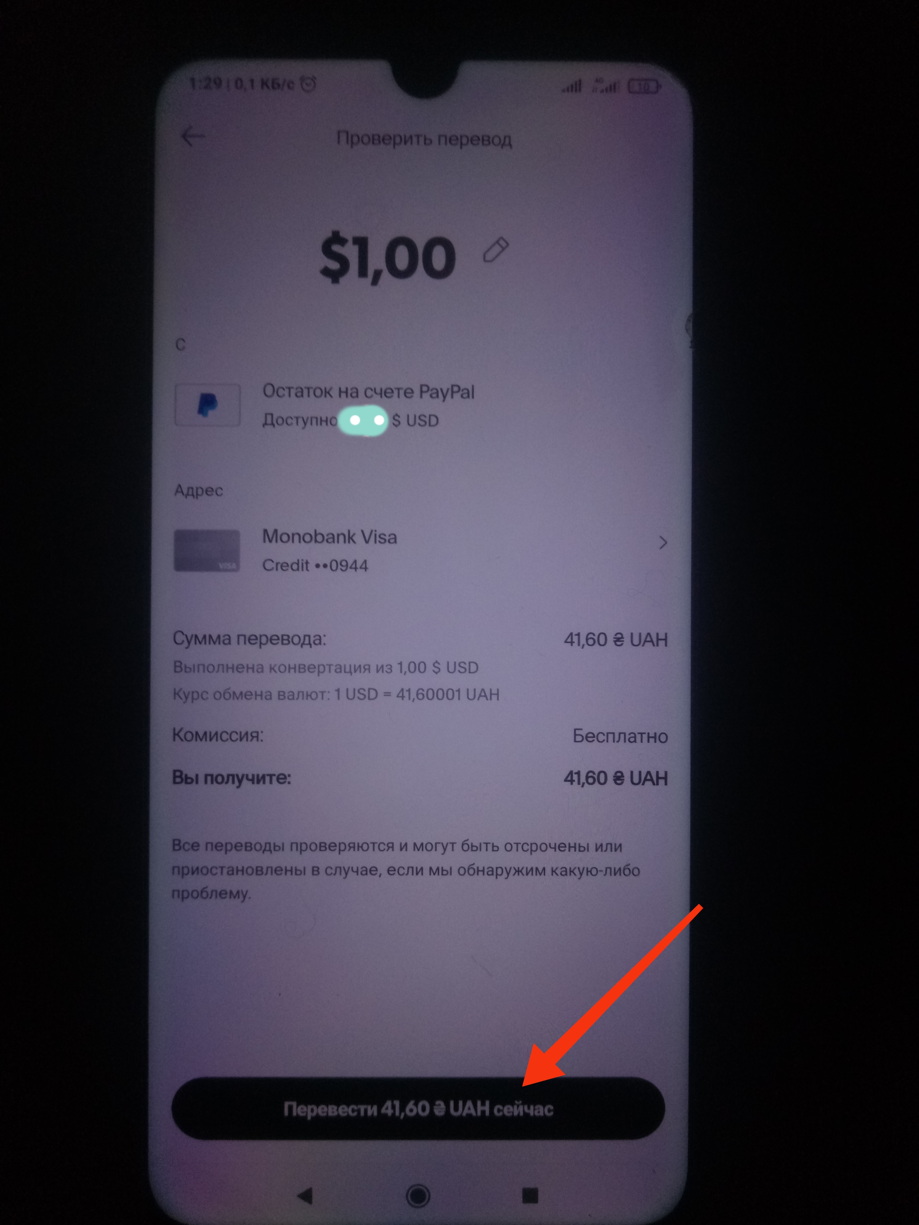 Відкриваєте застосунок PayPal На першій сторінці баланс на рахунку і список операцій. 1. Натискаємо на самі цифри у $ 2. Далі натисніть "перевод" 3. Наступне вікно з картками на які переводите гроші. Тут треба ввести номер картки на яку бажаєте перевести. Натиснути "далее" 4. Наступне вікно з сумою яку перераховуєте. Наприклад 1 $. 5. Наступне вікно підтвердження перерахування вже в гривні по курсу $ 6. І гроші миттєво на рахунку Монобанк
