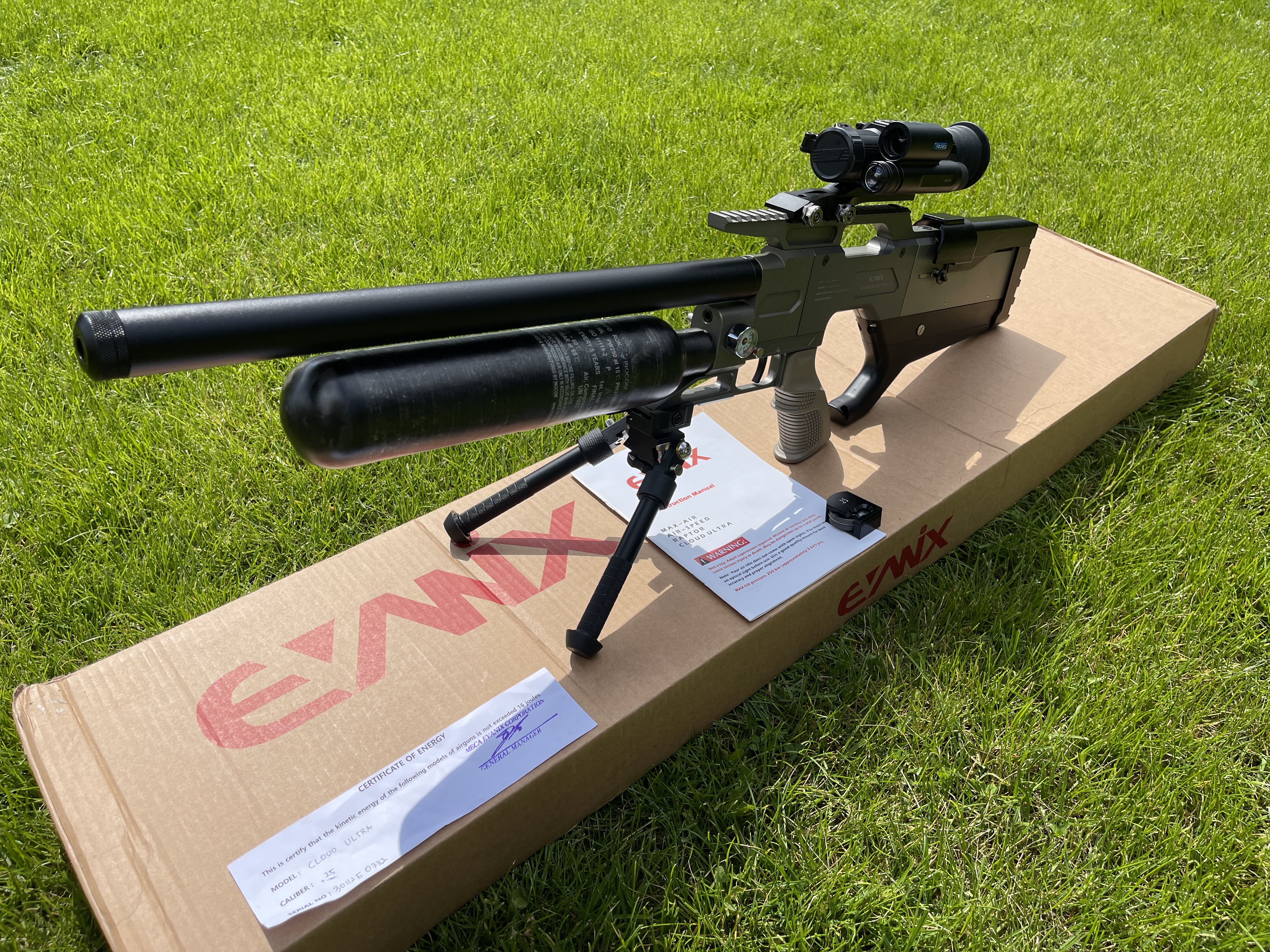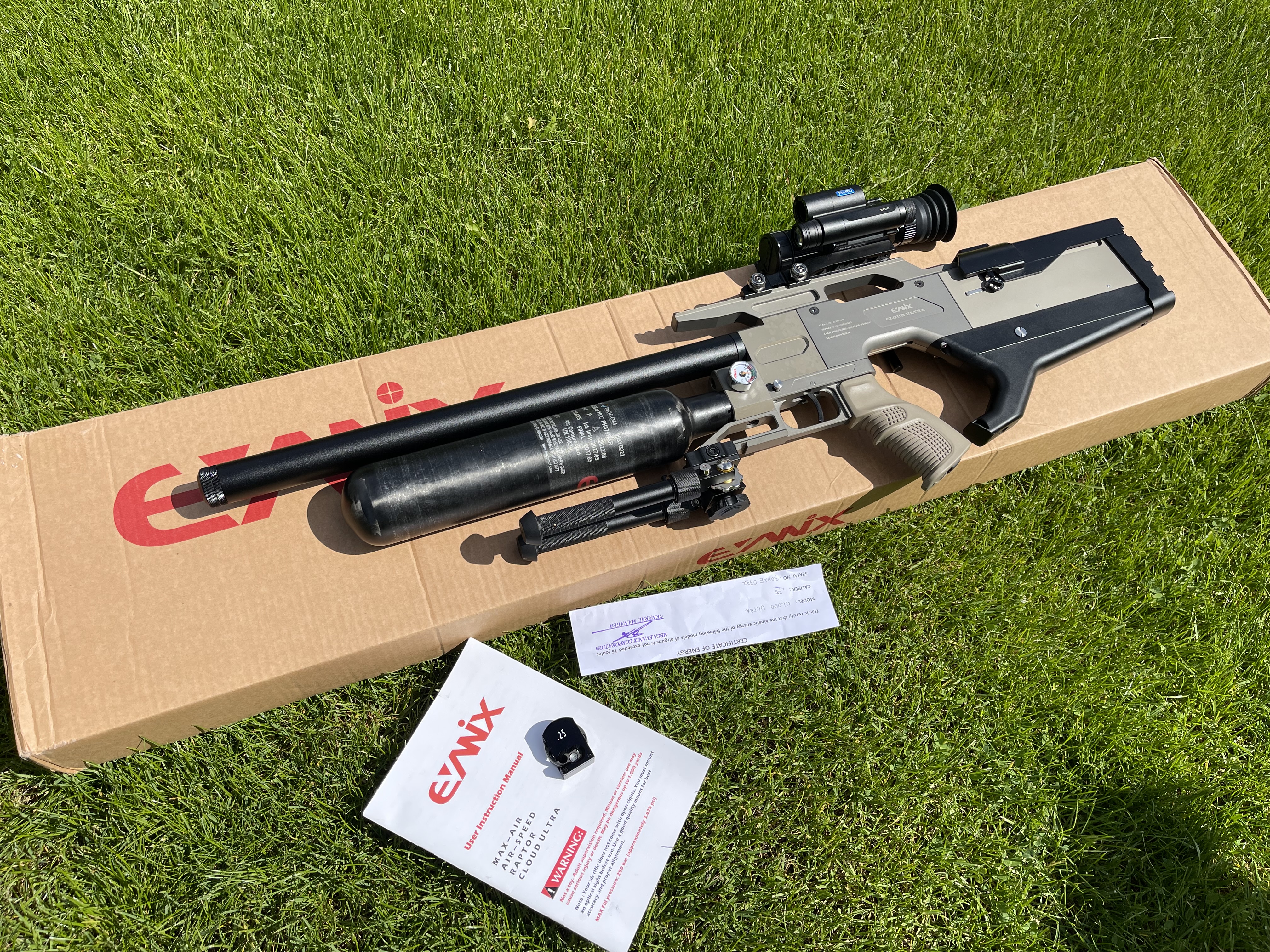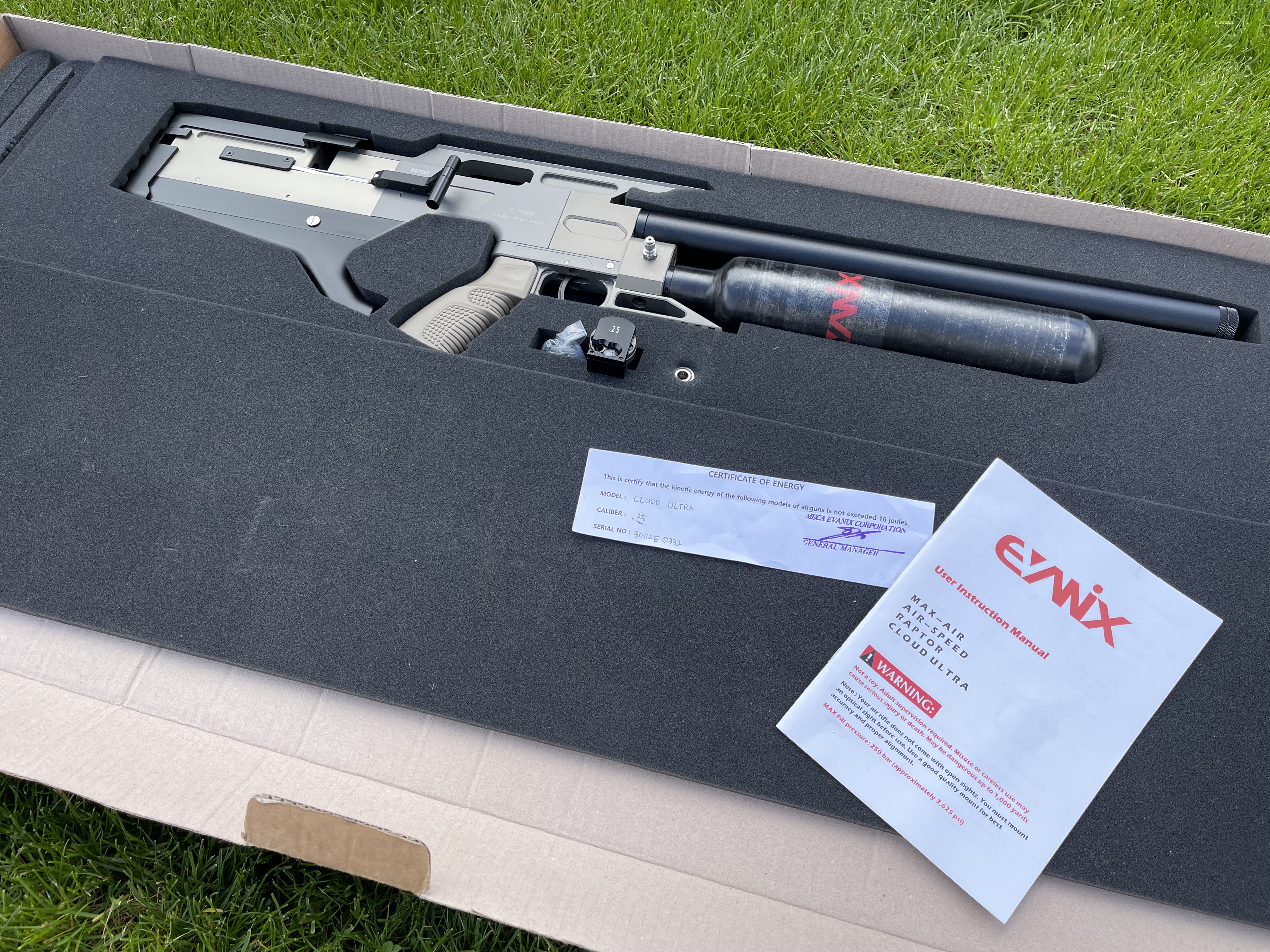 PCP Evanix Cloud Ultra - ДіД Напів-автомат. Нова. Виробник - Корея. Дуже зручна , та якісна гвинтівка , приємний баланс , тонкий дизайн. Довжина стволика - 550мм. Обʼєм колби - 0.58L. Вага - 3.5кг. Довжина - 83см. Комплектація : Коробка , гвинтівка , паспорт , сертифікат 16дж , заправочний квік , два магазини. Гвинтівка налаштована , збільшені перепуски і т.д. Швидкість Slug H&N - 1.94 - 270m Ціна 1800$