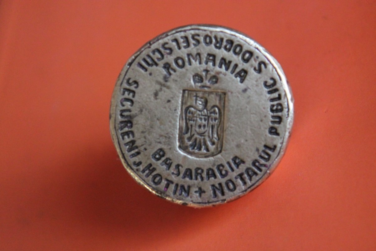 Судя по тому как я разобрал буквы - это печать нотариуса из Secureni (возможно населенный пункт Сокиряны) это современная Украина. Бывший Хотинский уезд Бессарабской губернии. Печать, видимо, периода румынской администрации 1918-1944.