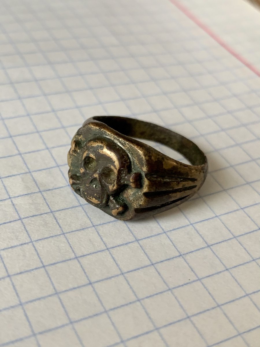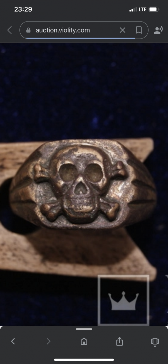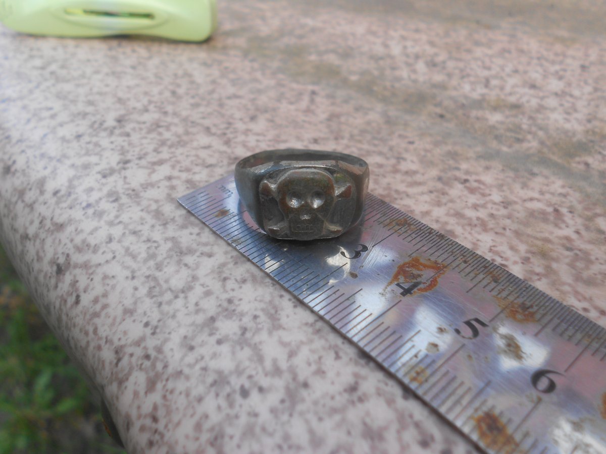 В отличие от приведенных Вами колец, кольцо топикстартера имеет слишком топорный вид, будто делал петеушник напильником. В частности, площадка под черепом абсолютно не симметрична, да и сам череп с костями кривые. Так что предмет вряд-ли из военного магазина третьего рейха, скорее окопный самопал.