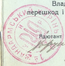 Печатка Жандармського куріня польової жандармерії армії УНР. 1920 рік. Відбиток печатки з особистого посвідчення №427.Польової жандармерії військ УНР Михайла Чабарика.