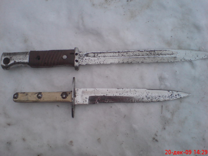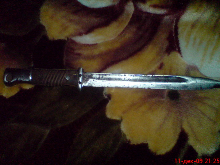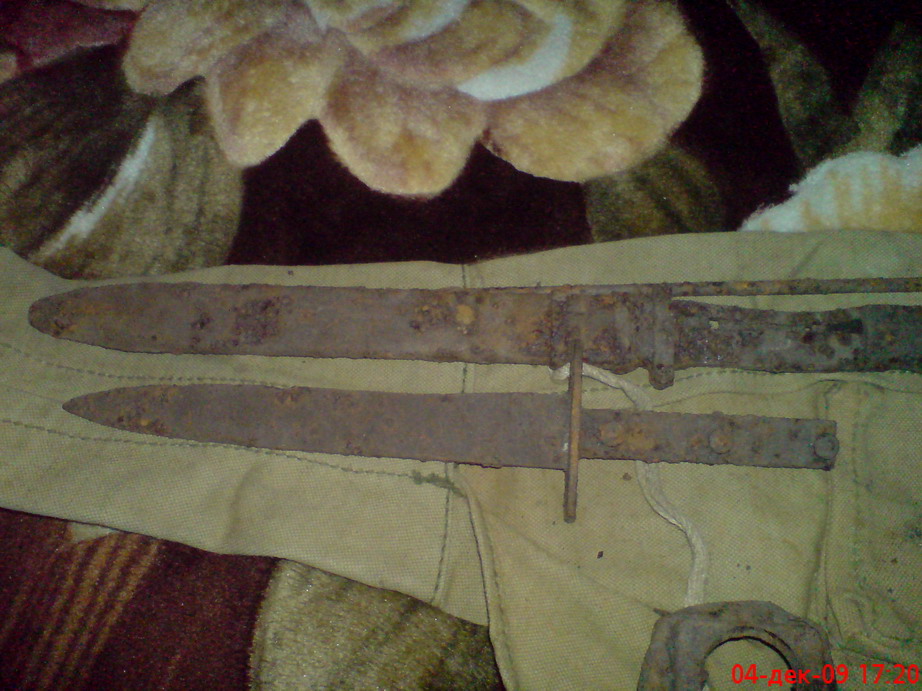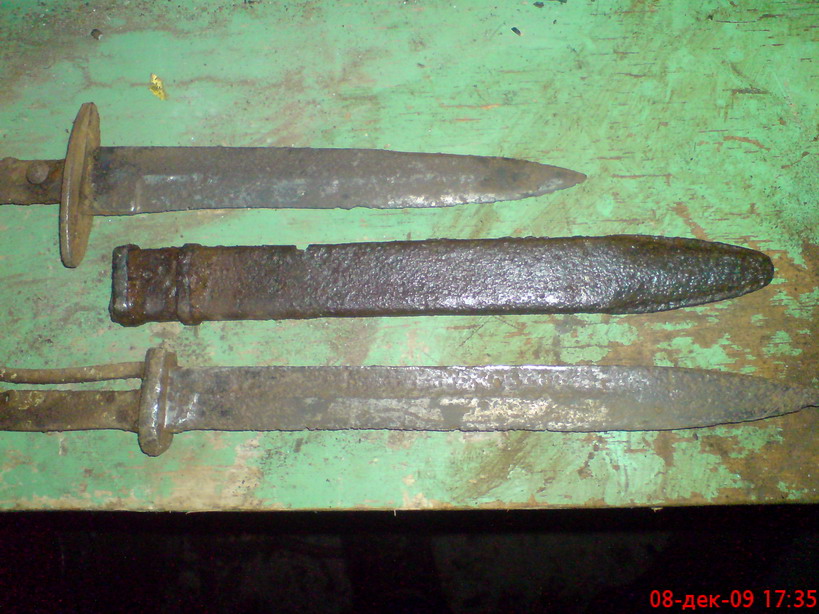 Штык я вынул,слегка поеден но вполне бодрый.Так что жить будет,рукоять наберу с поломанного.А ножны видать не его,но сидел в них как дома.