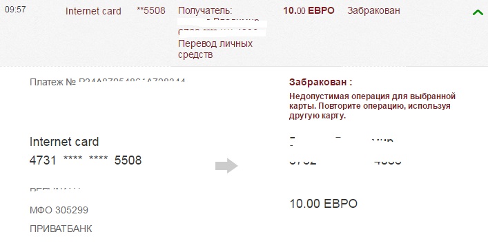 ... и видим статус платежа забракрован код какой то там пытался так же перекинуть 2.11.2016 немого человечку из рф, но нифига не получилось, сошлись на пополнении телефона
