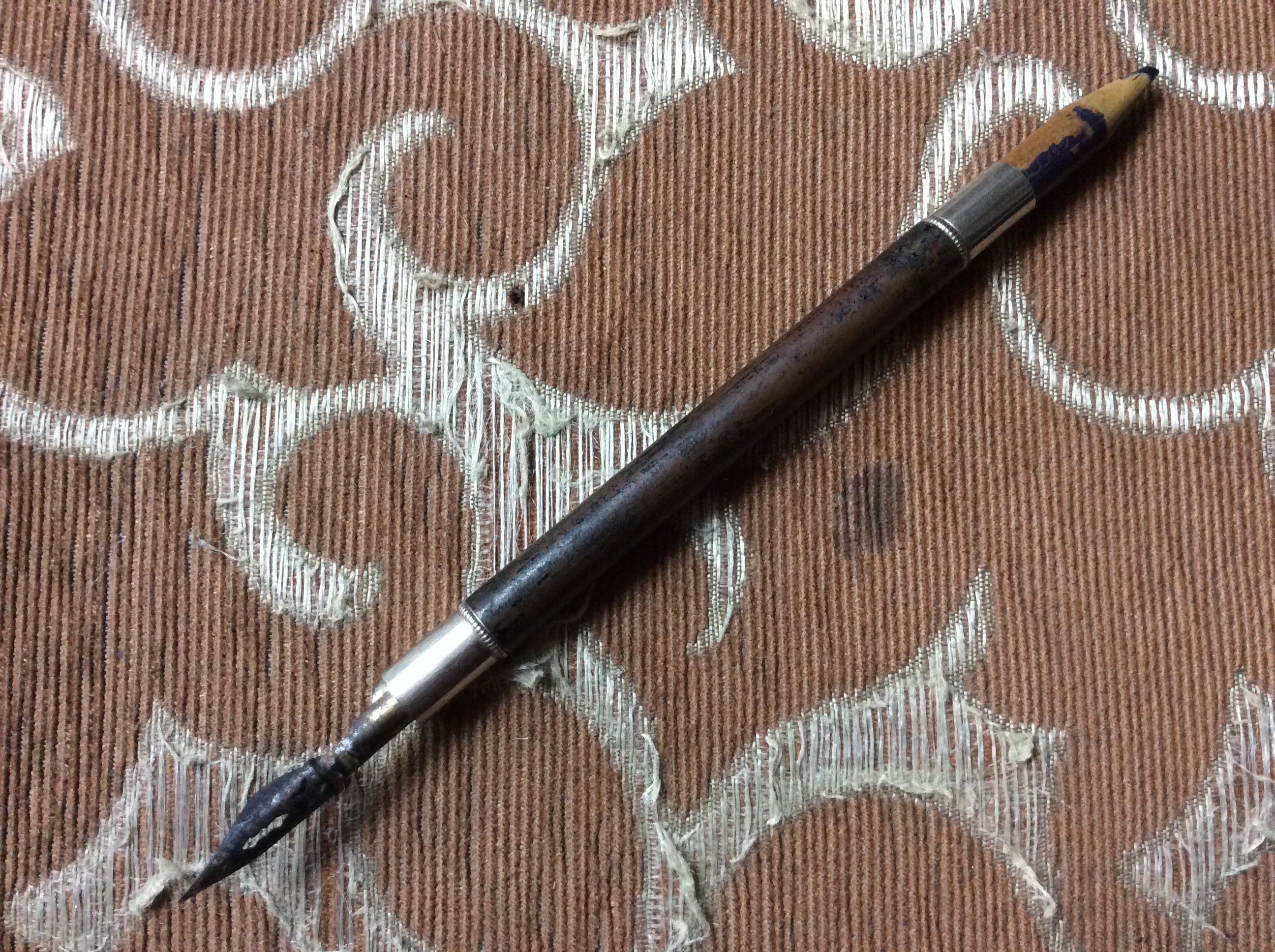 Лежала, маленькая. Найду дома, покажу. Найдена с остатками планшета. И подобное перо- карандаш..Но в труху. А в чернильнице и чернила остались.