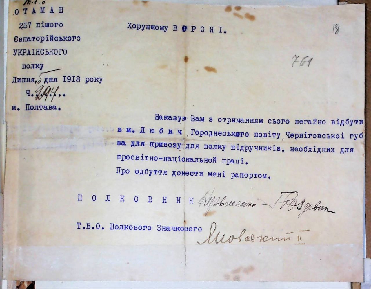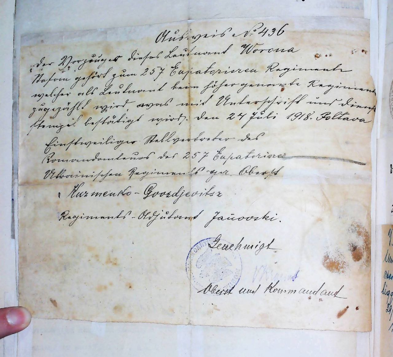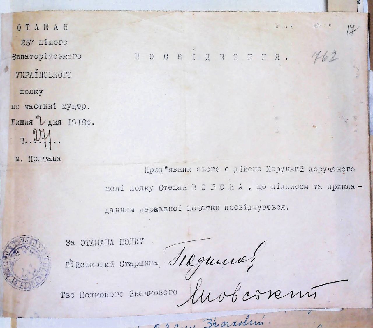 Ворона Степан Федорович - хорунжий Армії Української Деражави та військ Директорії. У лютому-березні 1918 року в складі 3-го пішому Запорізькому ім. Гетьмана Богдана Хмельницького полку перебував на посаді козака. Влітку-восени 1918 році служив хорунжим у 257 Євпаторійському полку в Полтаві, що входив до 6-го корпусу Української держави. В грудні 1918 - січні 1919 року ставновлював українську на Полтавщині (у Гребінці, Питрятині). Йморвіно був делегатом на Трудовий конгрес про що свідчить посвідка, що долучається.