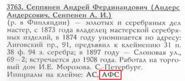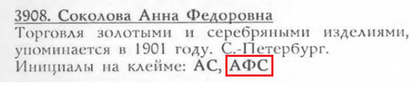 вітаю. по клейму АФС якщо клейма пробірера немає, лише по клейму майстра точно визначити рік не можна. наприклад СП, період 1873-1908р.р. СП, 1901 р. Кострома, 1880-і р.р. і т.д.