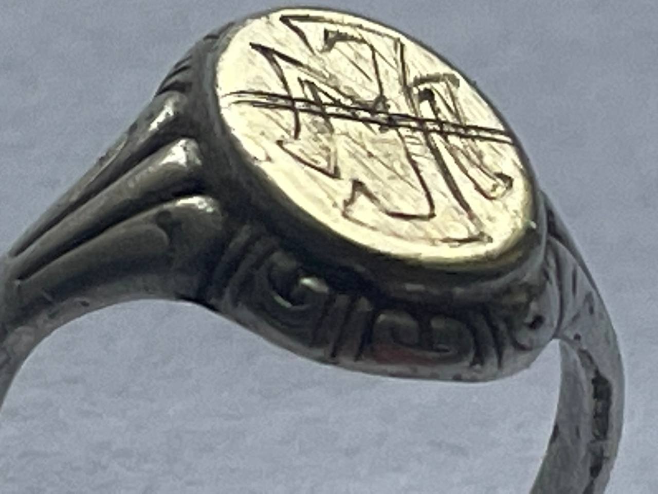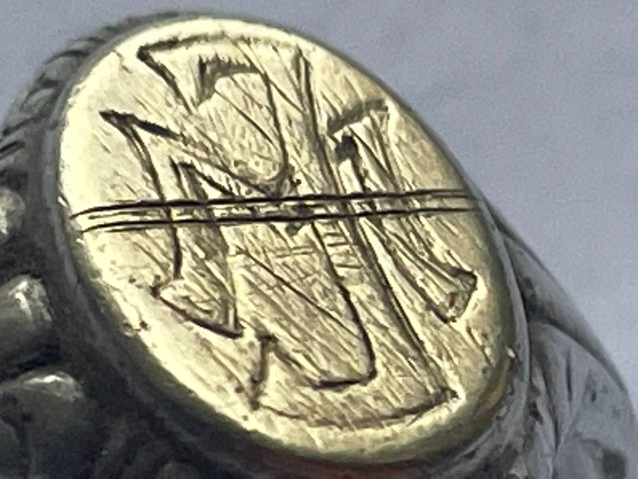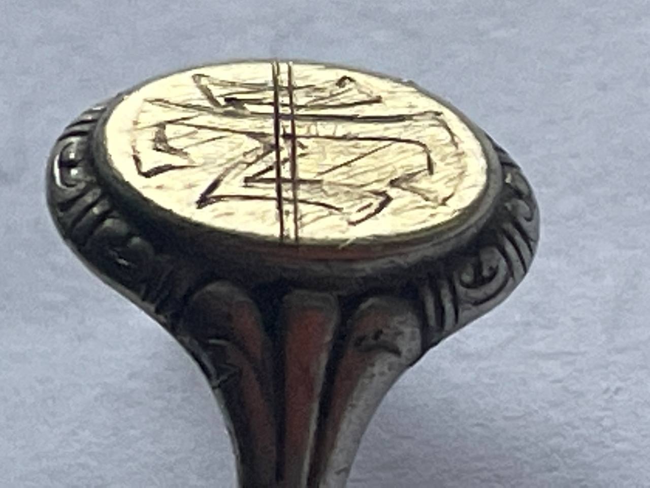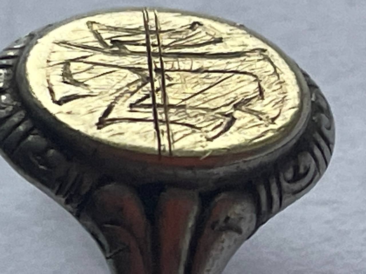 Добрый вечер. Подскажите пожалуйста что за перстень? И каких годов. На перстне Инициалы, серебро, и Щиток либо влит золотом или позолота. Вес около 5 грамм. Заранее спасибо С Ув