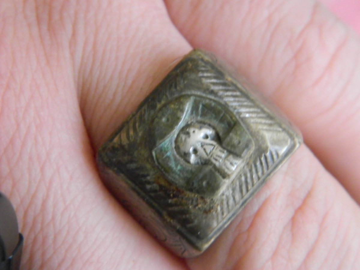 Привет всем форумчанам! На днях в лесу нашёл перстень.Материал: бронза, или сплав бронзы и меди?, накладка на щитке медь с серебряной вставкой в виде черепа. Подскажите по перстню, современный или ВОВ ? Также на поле попалась непонятная "штучка", материал свинец или олово. какие есть версии? Заранее благодарю!