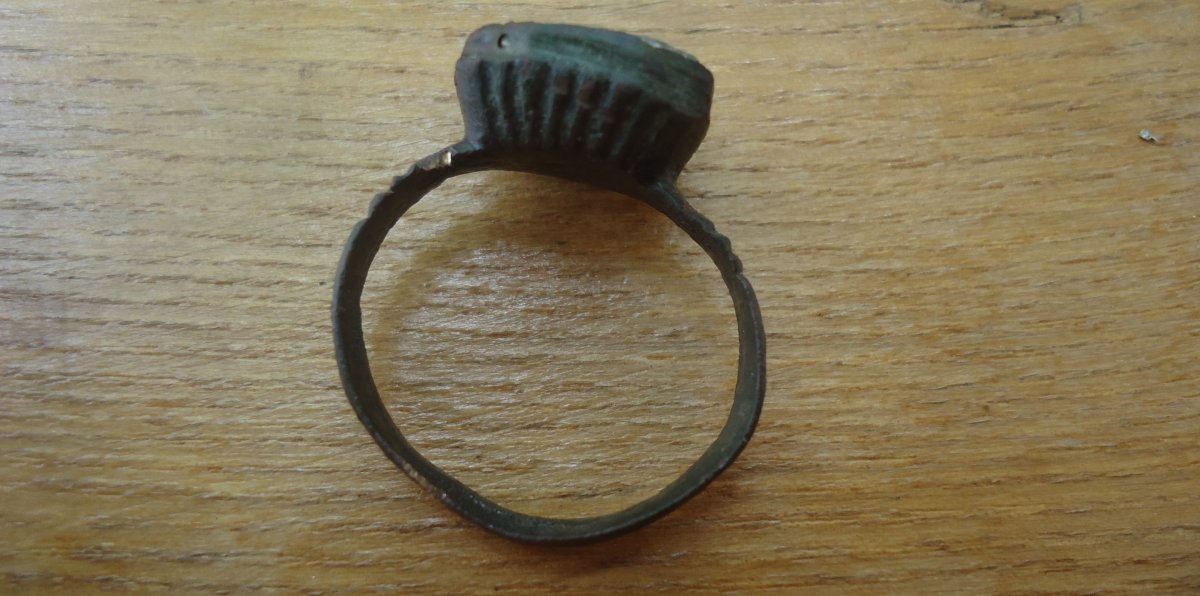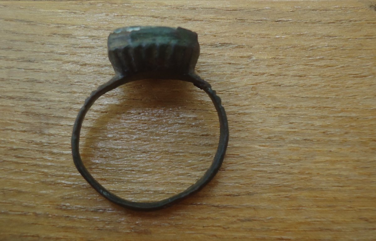 Здравствуйте. Перстень из бронзы с псевдодрагоценным камнем стеклярусом. Щиток перстня сделан в виде ковчега. 18-19 век. Мое мнение.