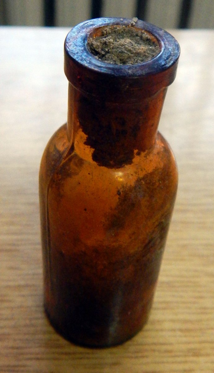 Бутылочку нашел уже в Киеве, в самом центре. На улице рыли трубы и проходя мимо в земле ее заметил, в середине остатки деревянной пробки.