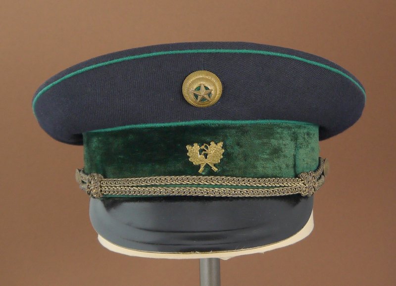 Цитирую документ от 1961 года: Эмблема к головным уборам состоит из двух латунных позолоченных скрещенных дубовых листьев с желудями, сверху которых расположен серп и молот. Размеры эмблемы для лесников и объездчиков -30Х35мм. Для начсостава -20Х25мм. Кстати на фото фуражка именно нач.состава ( с кокардой на тулье)