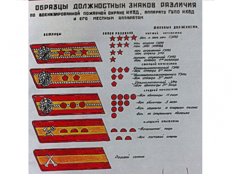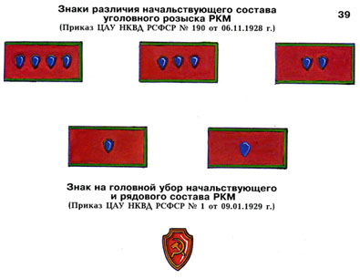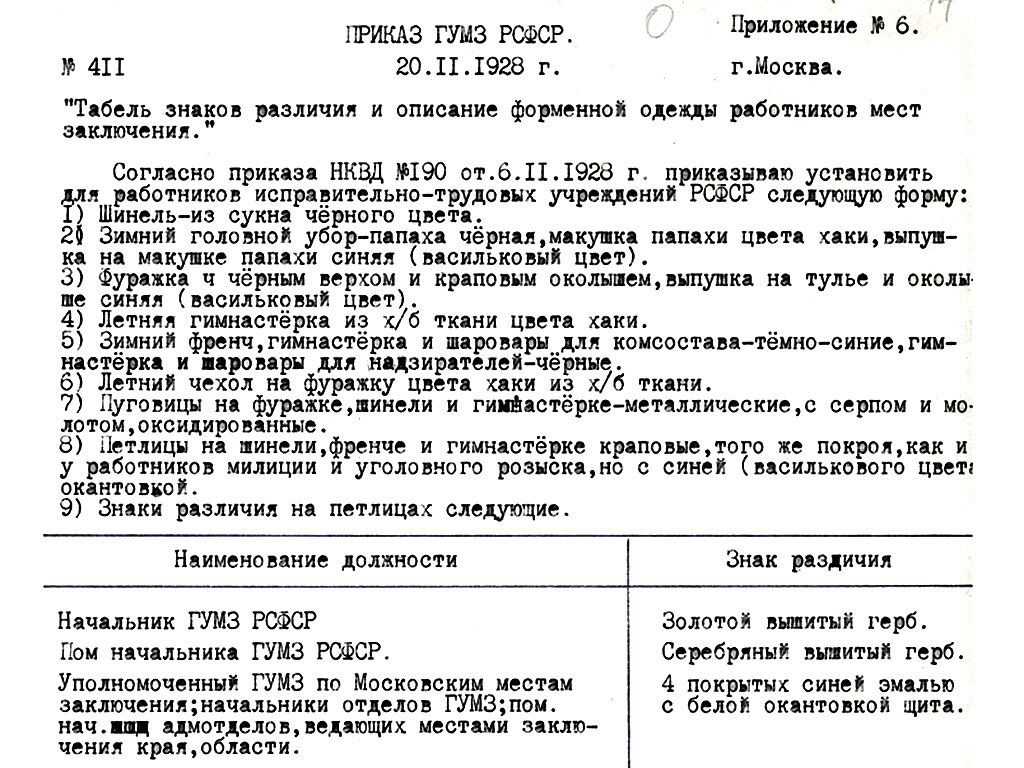 В согласии с Постановлением СНК от 1/8 с.г. об установлении форменной одежды для администрации и надзора мест заключения и по согласованию с начальником Управления Раб.Кр.-Красной Армии, Народным Комиссариатом Внутренних Дел 18 сентября с.г. утверждены следующие знаки различия на форменной одежде работников мест заключения по Главному Управлению местами заключемия и его местным органам.