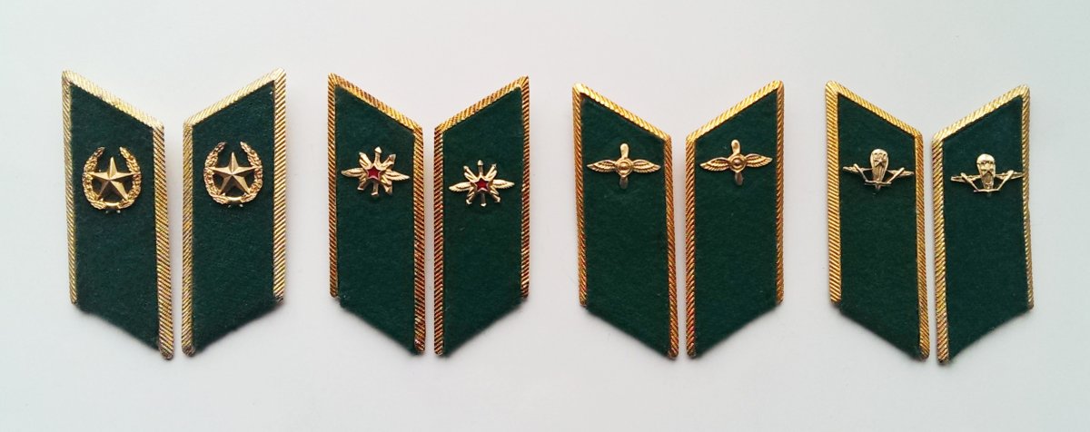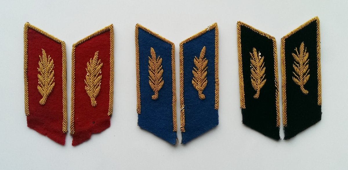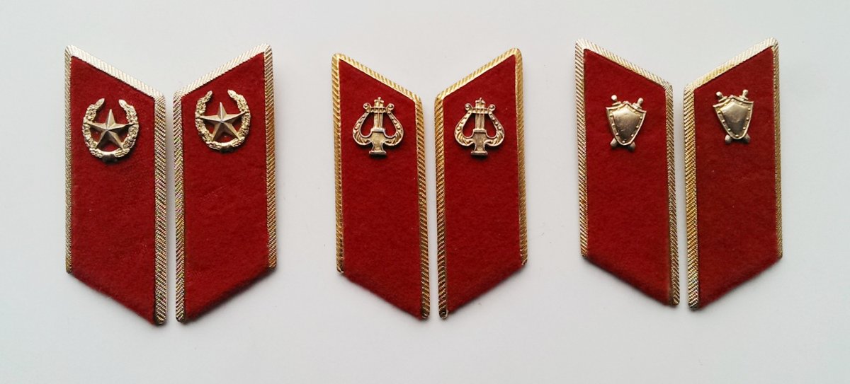 13. Петлицы к мундирам и кителям офицеров ,прапорщиков итд. Слева-направо: а) Общевойсковые б) Музыканты в) Юристы ( после Марта 1980 г.)
