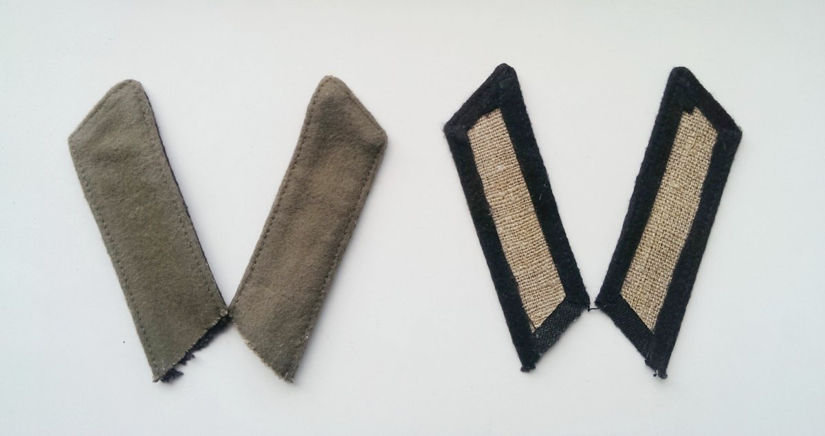 2.Петлицы обр.1955 года к шинелям и курткам ватным рядового и сержантского состава. Слева-байковые ХБ. Справа-суконные.