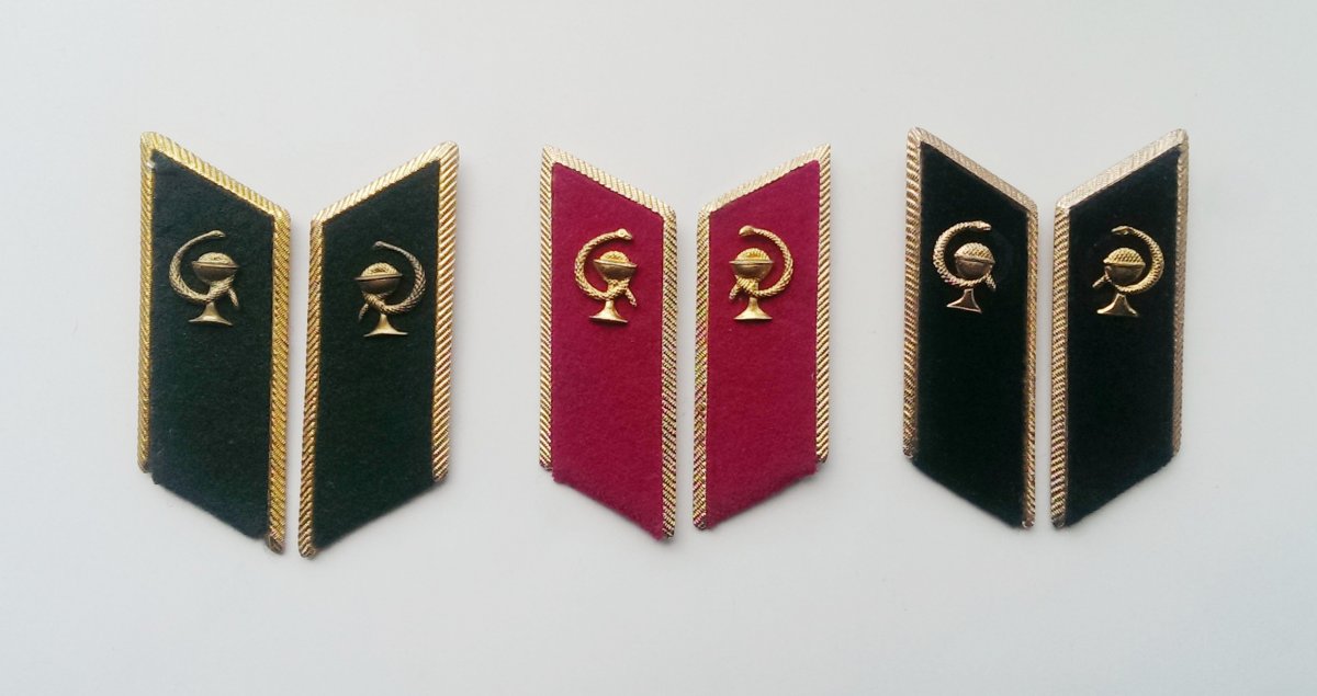 6.Петлицы к мундирам прадно-выходным офицеров медслужбы. Слева напрво : а) Обр.1964 г. б) Обр.1969 г. в) Обр.1969 г. (с Января 1974 года)