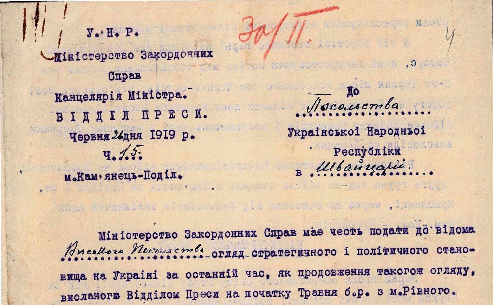 Про спробу захоплення влади П. Болбочаном. З огляду стратегічного і політичного становища в Україні, направленого Міністерством закордонних справ УНР Посольству УНР у Швейцарії. 26 червня 1919р.