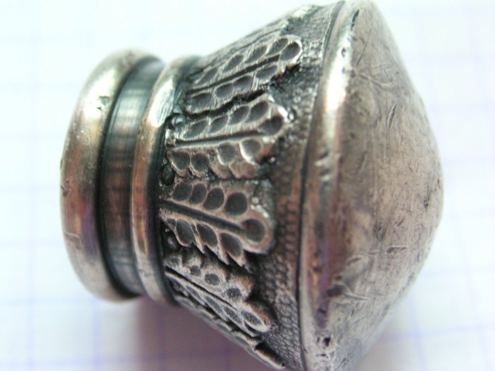 Судя по геометрии и рисунку, в том месте. где отсутствуют желуди, был или брак литья, или механическое повреждение навершия, которое обработали сначала надфилем, а потом доработали штихелем рисунок листьев. На фото хорошо видно, что все листья выпуклые (литьё), а один вдавленный (граверовка) + доработали соседние листья, чтобы сгладить восприятие. Ну, а желуди утратились окончательно. По-производителю пока ничего убедительного не нашёл.