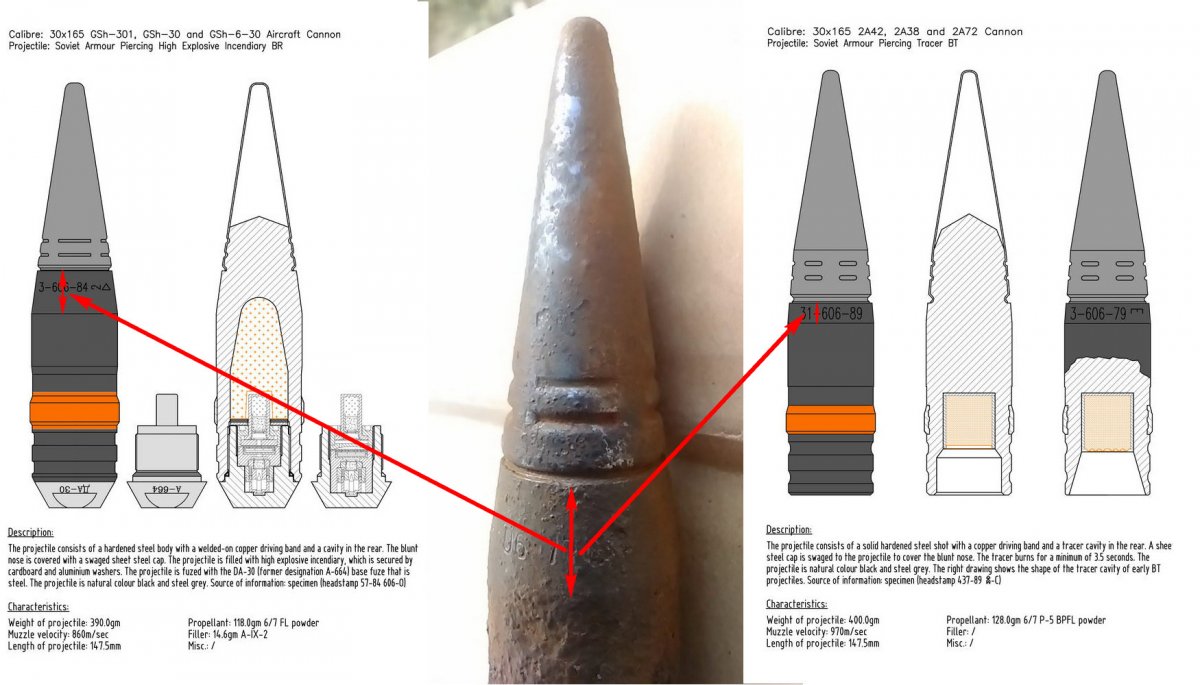 Я бы предположил (исходя из размеров части, что отметил на рисунках), что это выстрел с бронебойно-разрывный снарядом от авиапушки ГШ-30. Думаю по схеме всё ясно, что ЭТО и с чем оно внутри.